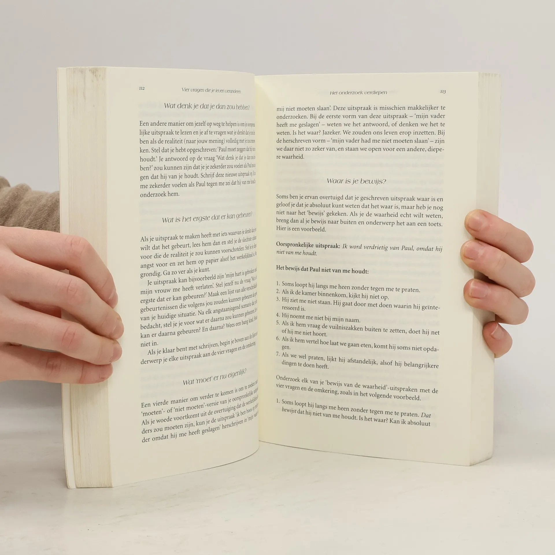 Zelfhulpboek om de realiteit onder ogen te zien door het beantwoorden van vier essentiële vragen.