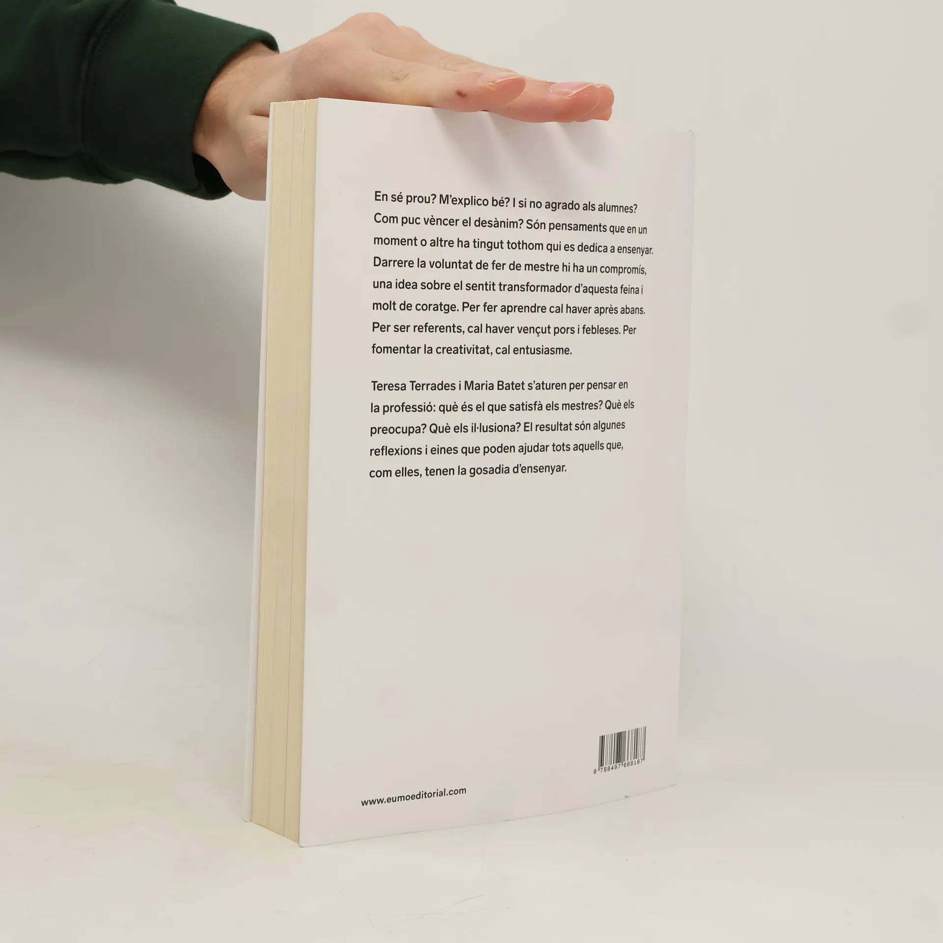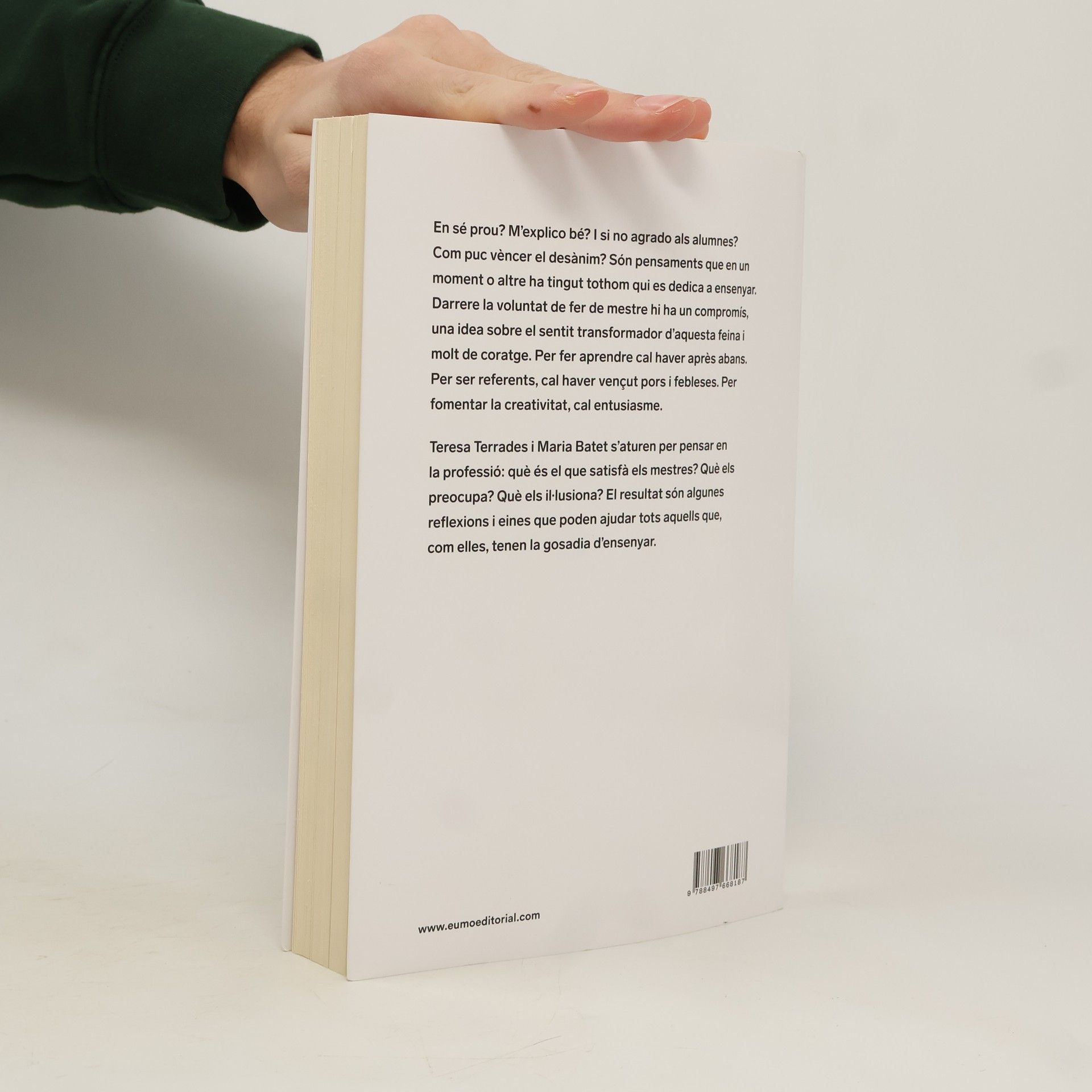 En sé prou? M'explico bé? I si no agrado als alumnes? Com puc vèncer el desànim? Són pensaments que en un moment o altre ha tingut tothom qui es dedica a ensenyar. Darrere la voluntat de fer de mestre hi ha un compromís, una idea sobre el sentit transformador d'aquesta feina i molt de coratge. Per fer aprendre cal haver après abans. Per ser referents cal haver vençut pors i febleses. Per fomentar la creativitat cal entusiasme. Teresa Terrades i Maria Batet s'aturen i pensen en la professió, en el que els agrada i el que no, en el que els preocupa i el que els il·lusiona. El resultat són algunes reflexions i eines que poden ajudar a tots aquells que, com elles, tenen la gosadia d'ensenyar.
