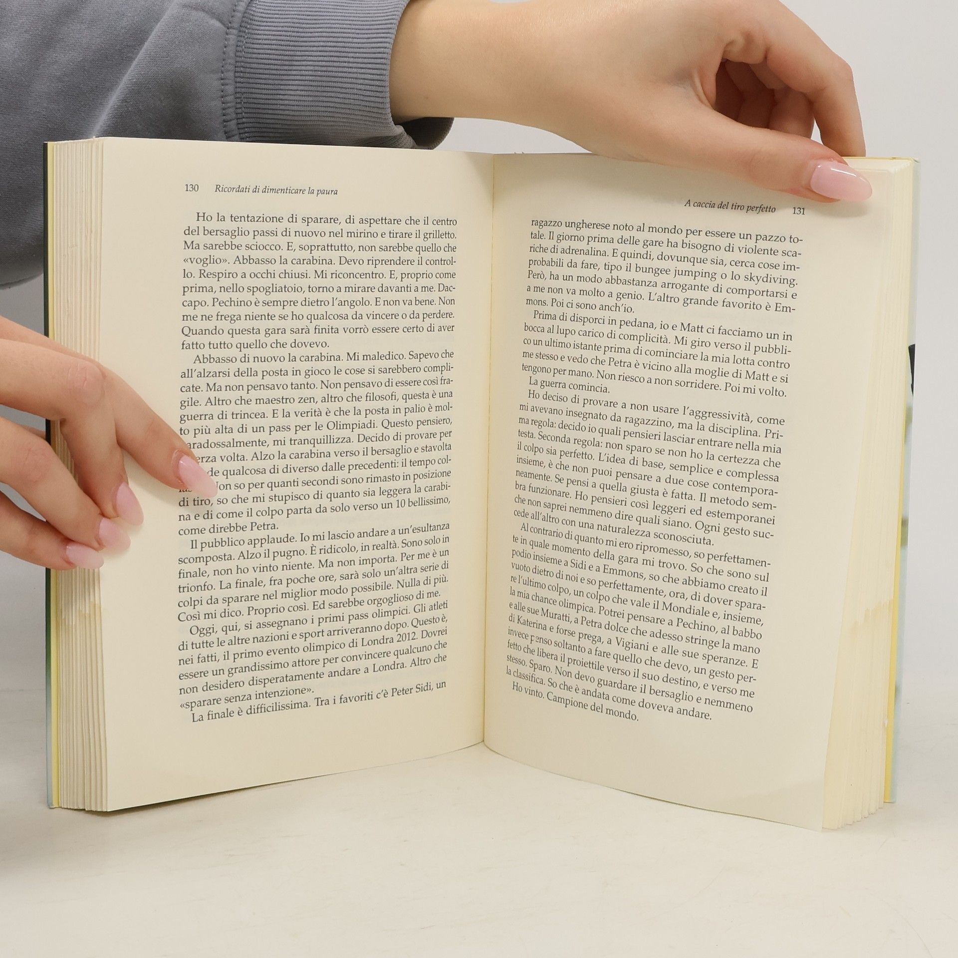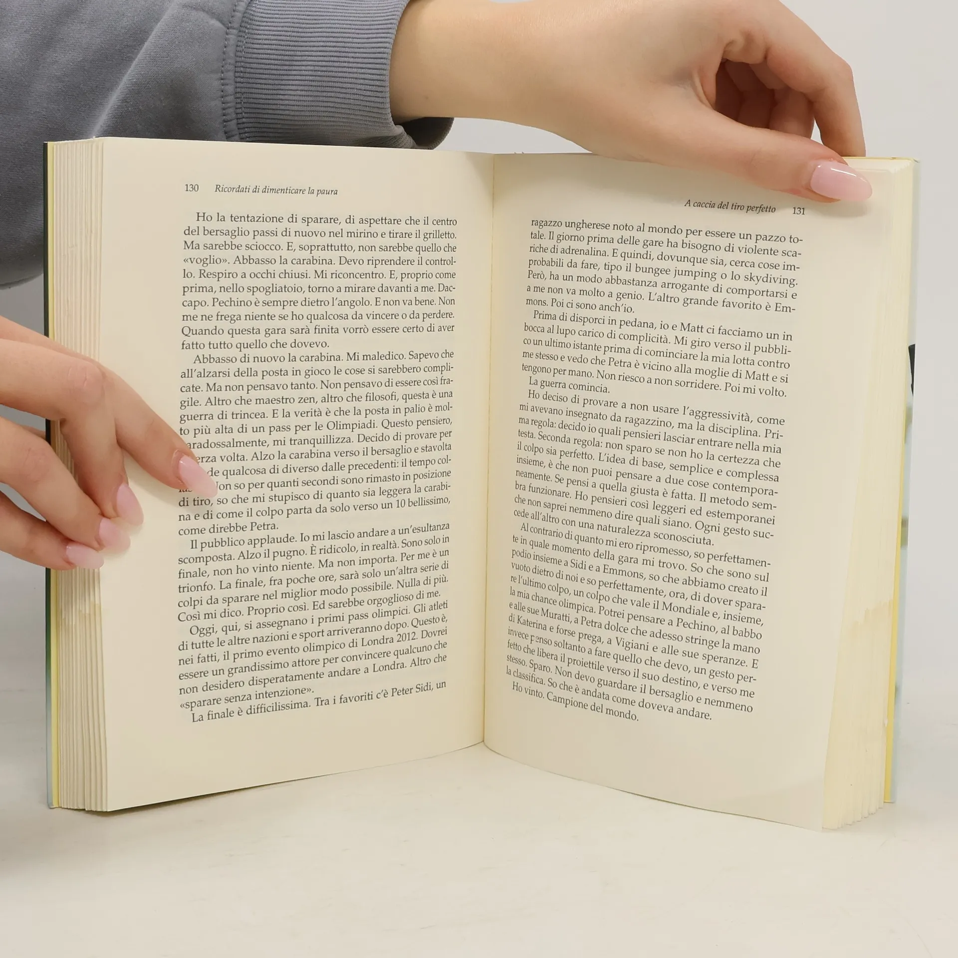 Una carabina sgangherata, un manuale di tiro scritto in cirillico («ma con molte illustrazioni»), un bersaglio perennemente occupato da una coppia di colombi che ha fatto il nido «nel posto più sbagliato della terra». Ma soprattutto tanta, tanta voglia di vincere. Il giovane Niccolò Campriani è uno studente d'ingegneria ma è anche il miglior tiratore «in piedi» mai nato nella storia del suo sport. Un predestinato. Nel giorno più importante della sua vita, alle Olimpiadi di Pechino del 2008, proprio nell'istante in cui sta per stringere tra le mani quello che ha sempre sognato, la medaglia d'oro, scopre di avere un avversario imprevisto e imbattibile. L'ultimo colpo. Quello decisivo. Il «blocco dell'ultimo colpo» si rivela un problema più grande del previsto. E per superarlo, Niccolò finisce per lasciare l'Italia e rifugiarsi in America. Lì, intraprende un viaggio dentro se stesso, alle origini dell'ambizione, alle radici stesse della propria essenza di uomo, tra i sogni di gloria e gli equivoci imposti da un ambiente e un paese, l'Italia, che non sa più vincere, ma neppure più perdere. Quattro anni di studio, allenamenti e riflessioni da «cervello in fuga», per scoprire infine che «tra il mirino e il bersaglio non c'è solamente aria e distanza», ma anche paura. Paura di fallire e di deludere gli altri e soprattutto se stessi. Paura, insomma, di dover fare i conti con la propria identità. Durante questo viaggio, Niccolò incontrerà il «se stesso» tredicenne; lo rivedrà in mutande, da solo, davanti a uno specchio, intento a concentrarsi, durante un'interminabile notte, alla vigilia di una gara, la prima, quella in cui cominciò il gigantesco equivoco della sua vita di atleta. Da quella notte, risalirà controcorrente il fiume della propria vita, incrociando personaggi e voci e fantasmi, e imparando finalmente che accettare i propri limiti è il primo passo da compiere non per superarli, ma per provare a spostarli un po' più in là. «Ricordati di dimenticare la paura», la frase ascoltata nel momento più inatteso di questo viaggio, diventa così il mantra che lo porterà a ritrovare la sua strada di uomo e di sportivo. «Cos?è che fa di un atleta un campione?» chiedono a Niccolò alla fine di questo suo romanzo di formazione. «Non lo so. Davvero, ancora non lo so. Però adesso posso dire con certezza che cosa fa di un atleta un uomo felice».