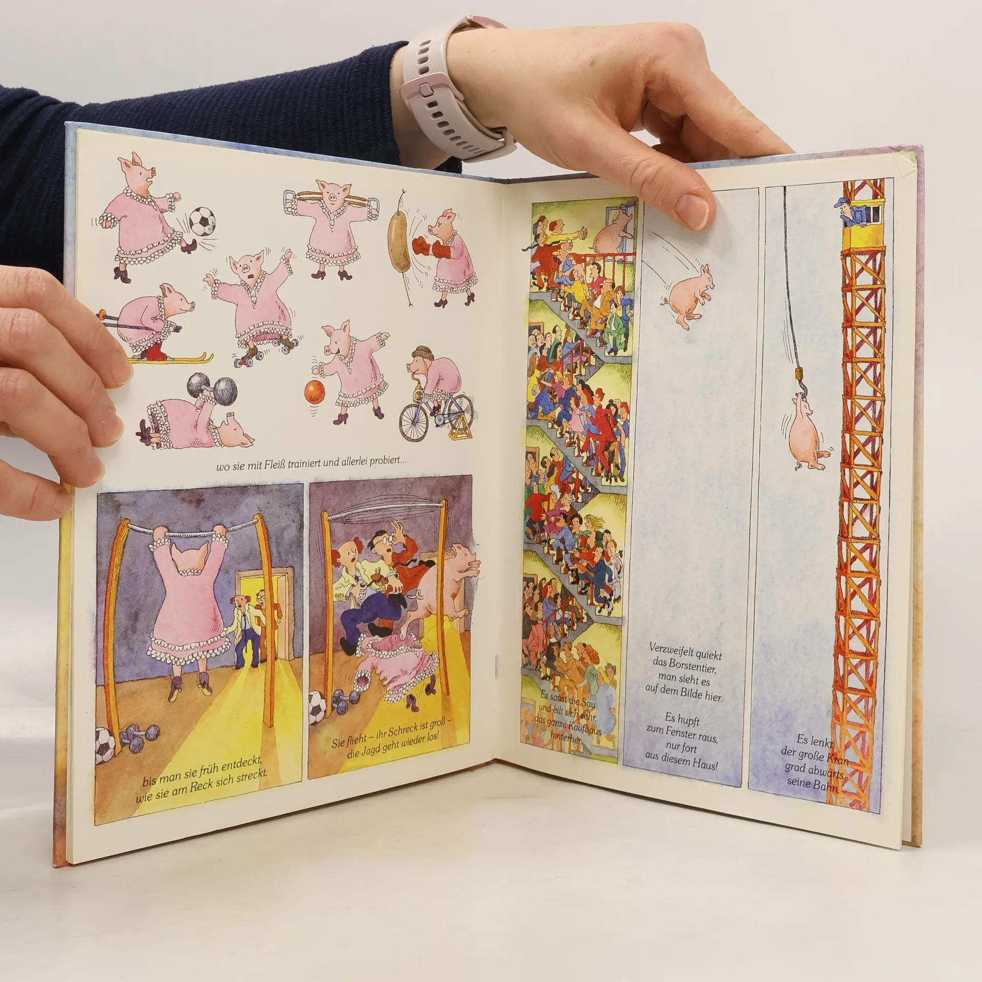 Morsom tegneserielignende billedbog med rimtekst om en so, der skaber stor forvirring på markedet.