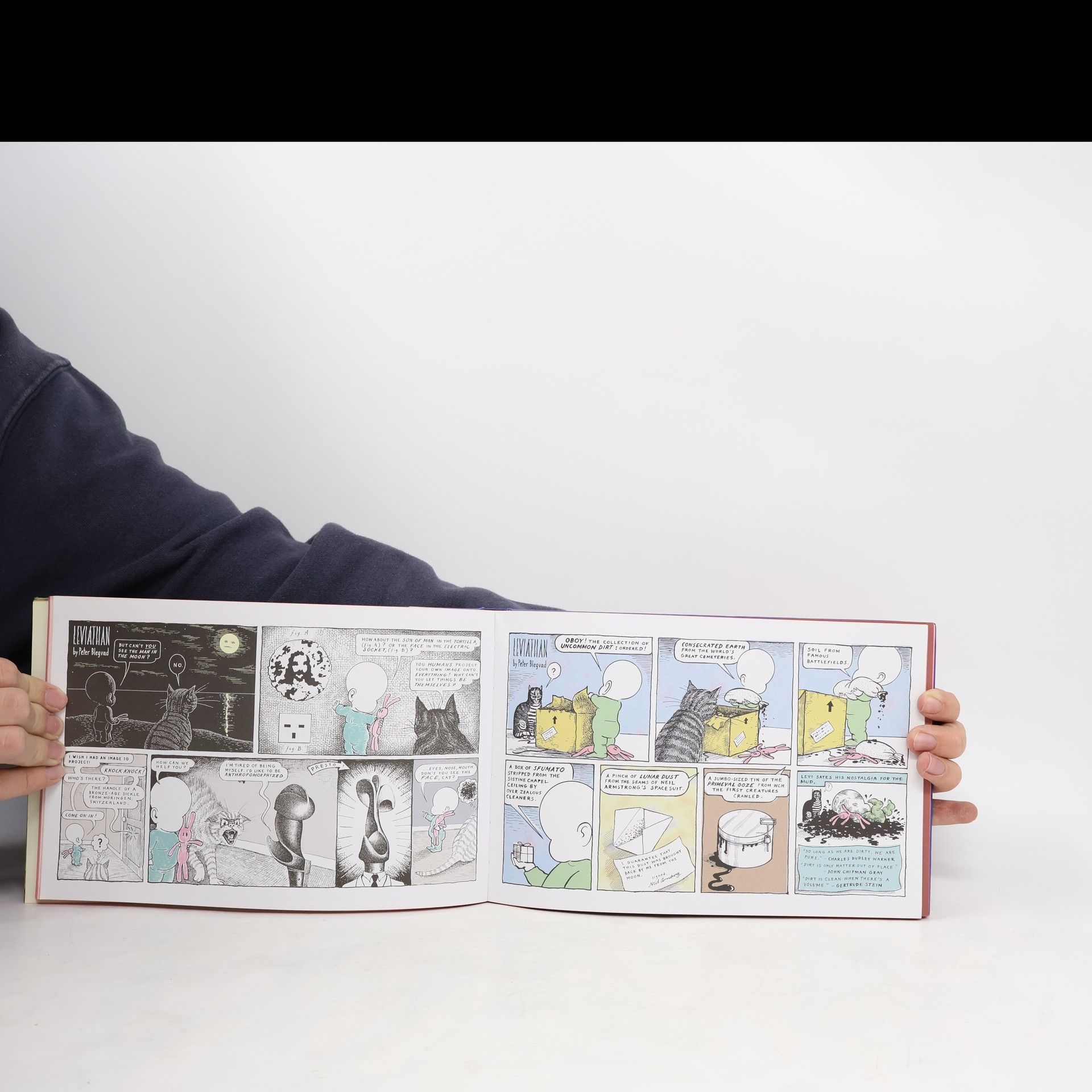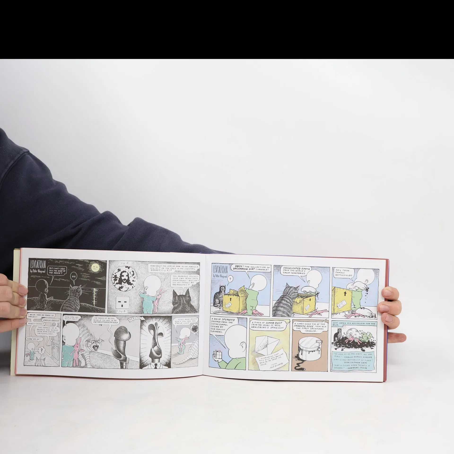 Welcome to a new strange world. In a dazzling work of graphic fiction, a surreal journey through a wonderland eerily like real life, The Book of Leviathan chronicles an infant's investigations into life's great mysteries. Endowed with a preternatural interest in metaphysics and philosophy, yet as confused as any innocent by the vagaries of adult behavior, little Levi bears the added burden of living in a world that can literally change at the stroke of a pen.Aided by a wise pet ("Cat") and a favorite toy ("Bunny"), Levi encounters a frothing ectoplasmic Hegel and a woefully off-the-mark Freud. In less heady adventures, Levi contemplates why his parents disappear at night (and whether he is wholeheartedly pleased when they return each morning); the regrettable liberties taken with the English language; and the relationship between Bennetton and Pablo Neruda.Peter Blegvad's Book of Leviathan assembles the cream from Levi and Cat's adventures, published in The Independent on Sunday newspaper in the twilight years of the old Millennium. Blegvad's darkly humorous work has been described by Matt Groening as "one of the weirdest things I've ever stared at". Quirky and referential, dark and droll by turn, it follows the faceless baby Levi's journeys into and out of the world. They are escapes, but as some sage once observed, only a jailer would consider the term "escapist" pejorative.