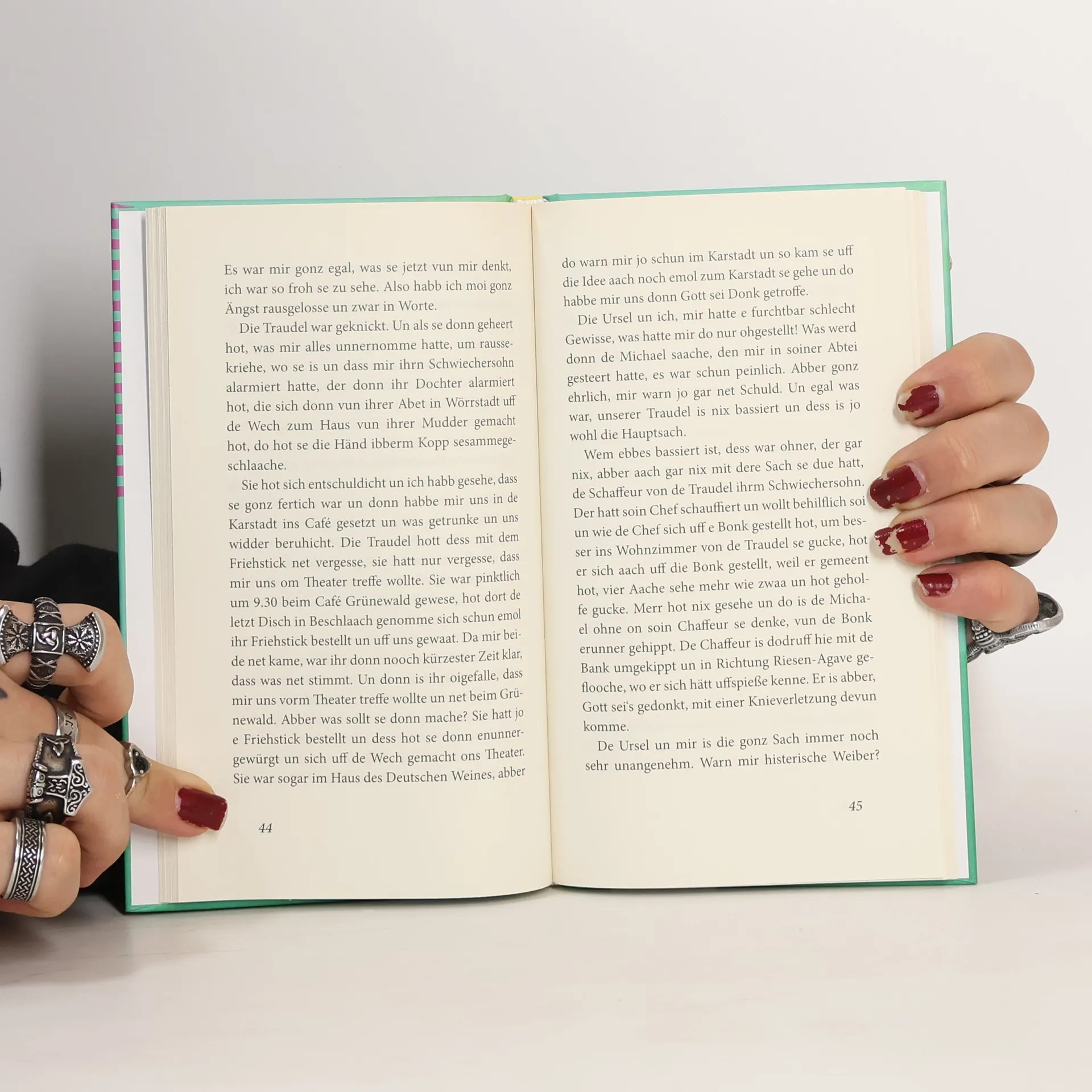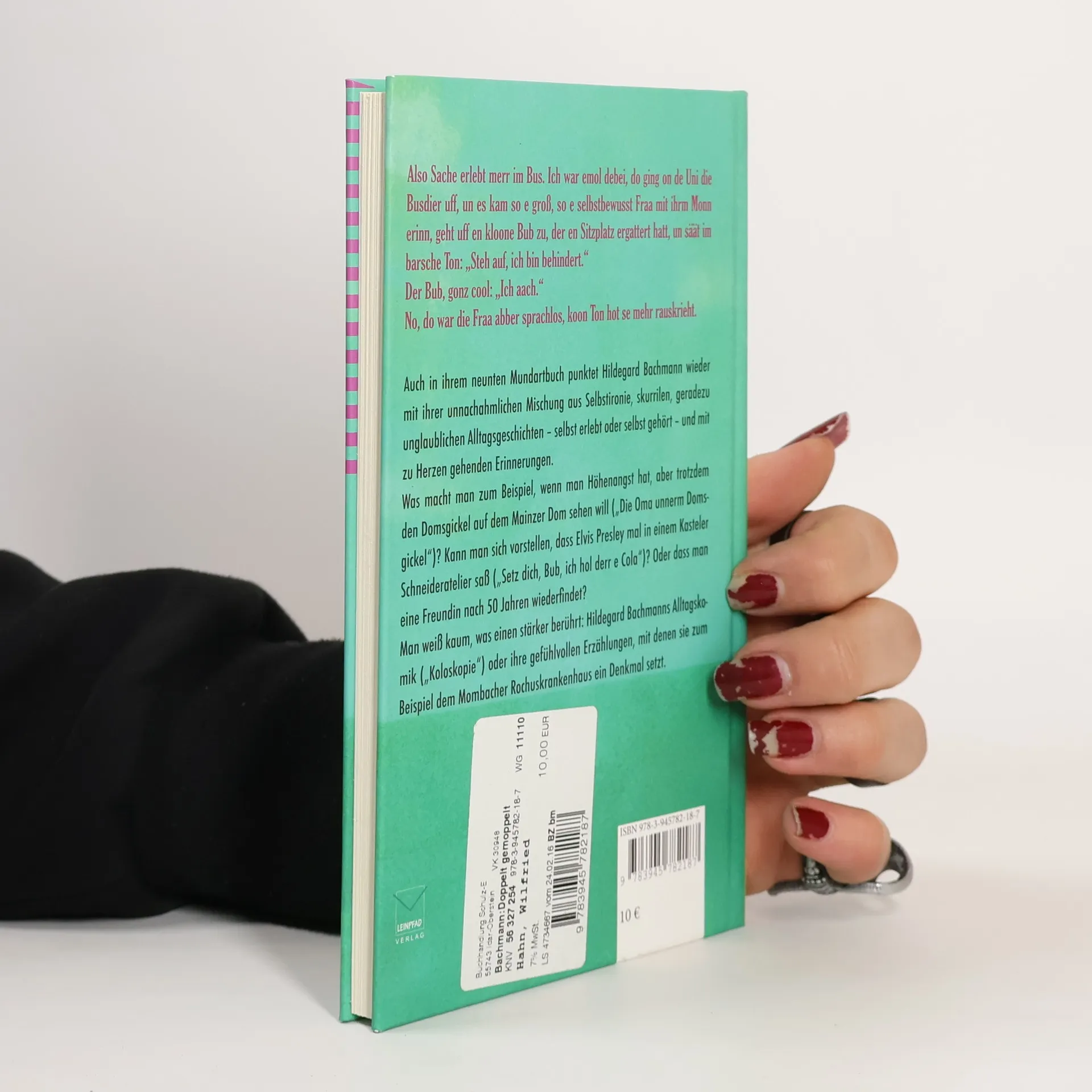„Also Sache erlebt merr im Bus. Ich war emol debei, do ging on de Uni die Busdier uff, un es kam so e groß, so e selbstbewusst Fraa mit ihrm Monn erinn, geht uff en kloone Bub zu, der en Sitzplatz ergattert hatt, un säät im barsche Ton: „Steh auf, ich bin behindert.“ Der Bub, gonz cool: „Ich aach.“ No, do war die Fraa abber sprachlos, koon Ton hot se mehr rauskrieht.“ Auch in ihrem neunten Mundartbuch punktet Hildegard Bachmann wieder mit ihrer unnachahmlichen Mischung aus Selbstironie, skurrilen, geradezu unglaublichen Alltagsgeschichten – selbst erlebt oder selbst gehört – und mit zu Herzen gehenden Erinnerungen. Was macht man zum Beispiel, wenn man Höhenangst hat, aber trotzdem den Domsgickel auf dem Mainzer Dom sehen will („Die Oma unnerm Domsgickel“)? Kann man sich vorstellen, dass Elvis Presley jemals in einem Kasteler Schneideratelier saß („Setz dich, Bub, ich hol derr e Cola„)? Oder dass man eine Freundin nach 50 Jahren wieder findet? Man weiß kaum, was einem mehr mitreißt und berührt, Hildegard Bachmanns Alltagskomik („Koloskopie“) oder ihre gefühlvollen Erzählungen, mit denen sie zum Beispiel dem Mombacher Rochuskrankenhaus ein Denkmal setzt.