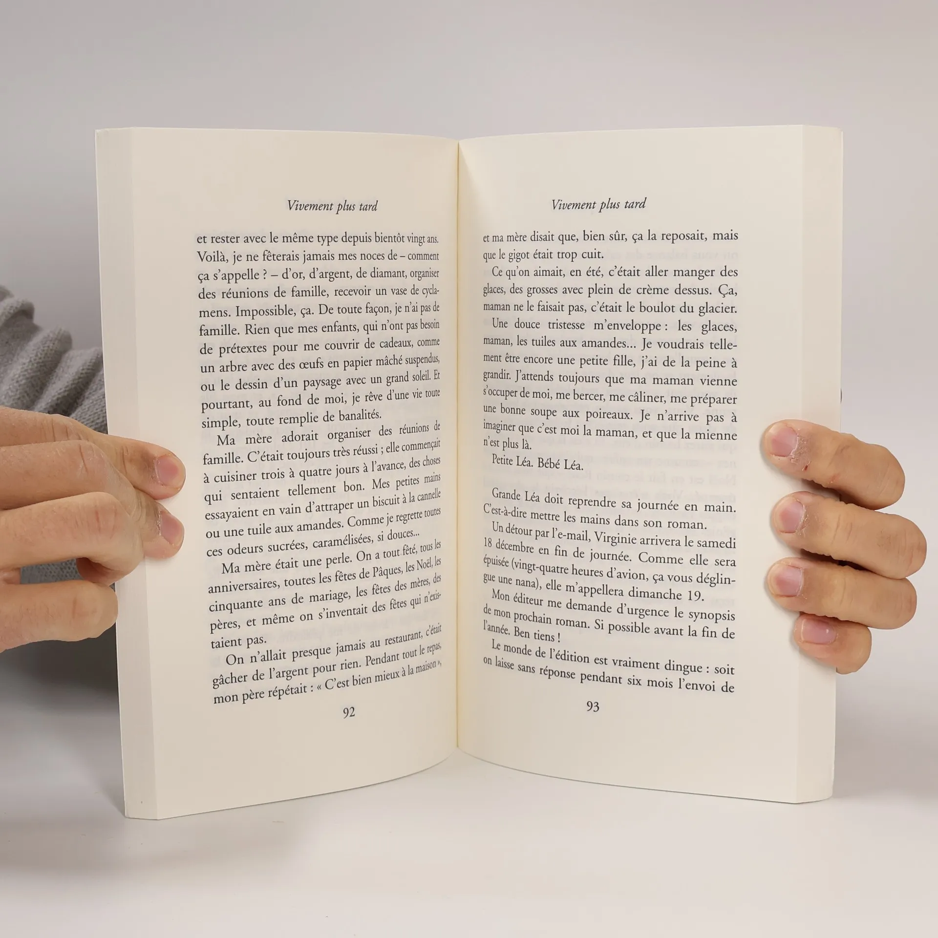 Léa a quarante ans, un chien, un chat, deux enfants, deux ex-maris et une unique recette : le lapin à la moutarde.Elle écrit des romans, entretient une amitié platonique avec Yvan, qu'elle aimerait peut-être si elle n'aimait pas Thomas, qui ne quittera jamais sa femme pour elle. Bref, le temps presse, passe, elle a des factures à payer, le chien à sortir, son livre à finir et ses enfants à élever et... vivement plus tard !Drolatique et émouvant portrait d'une femme moderne en proie aux contradictions de toujours, vif comme un coup de vent, ce roman de Nicole Castioni, fait rire, fait mal et fait mouche.