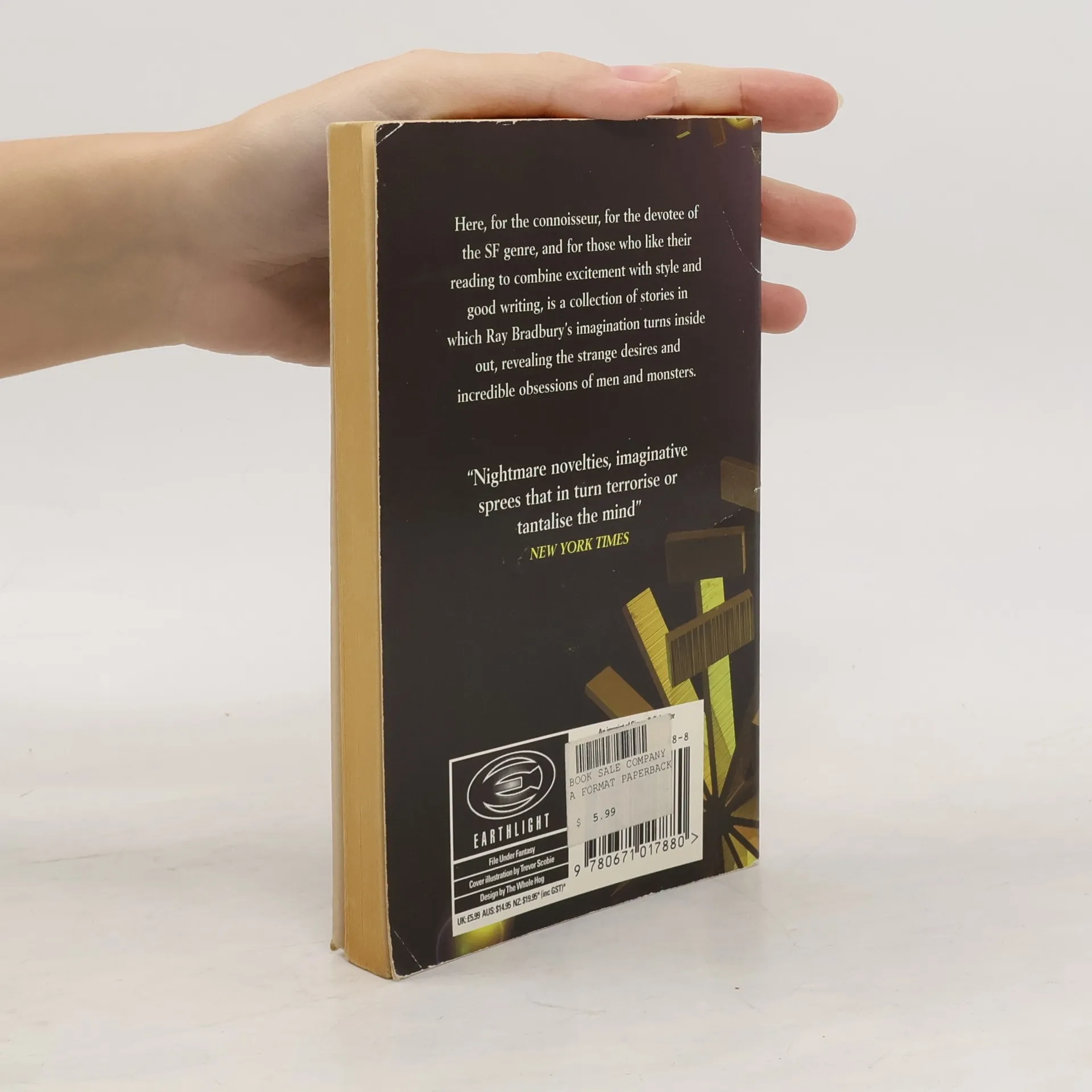 Cover Illustration: Trevor Scobie Set the controls for the heart of the sun. The Captain bent in the warm air, cursing, felt his hands run over the cold machine, and while he worked he saw a future which was removed from them by the merest breath. He saw the skin peel from the rocket beehive, men thus revealed running, running, mouths shrieking, soundless. Space was a black mossed well where life drowned its roars and terrors. Scream a big scream, but space snuffed it out before it was half up your throat. Men scurried, ants in a flaming matchbox; the ship was dripping lava, gushing steam, nothing! Journey with the century's most popular fantasy writer into a world of wonder and horror beyond your wildest dreams. Contents: - The Fog Horn (1951) - The Pedestrian (1951) - The April Witch (1952) - The Wilderness (1952) - The Fruit at the Bottom of the Bowl (1948) - Invisible Boy (1945) - The Flying Machine (1953) - The Murderer (1953) - The Golden Kite, the Silver Wind (1953) - I See You Never (1947) - Embroidery (1951) - The Big Black and White Game (1945) - A Sound of Thunder (1952) - The Great Wide World Over There (1952) - Powerhouse (1948) - En la Noche (1952) - Sun and Shadow (1953) - The Meadow (1953) - The Garbage Collector (1953) - The Great Fire (1949) - Hail and Farewell (1953) - The Golden Apples of the Sun (1953)