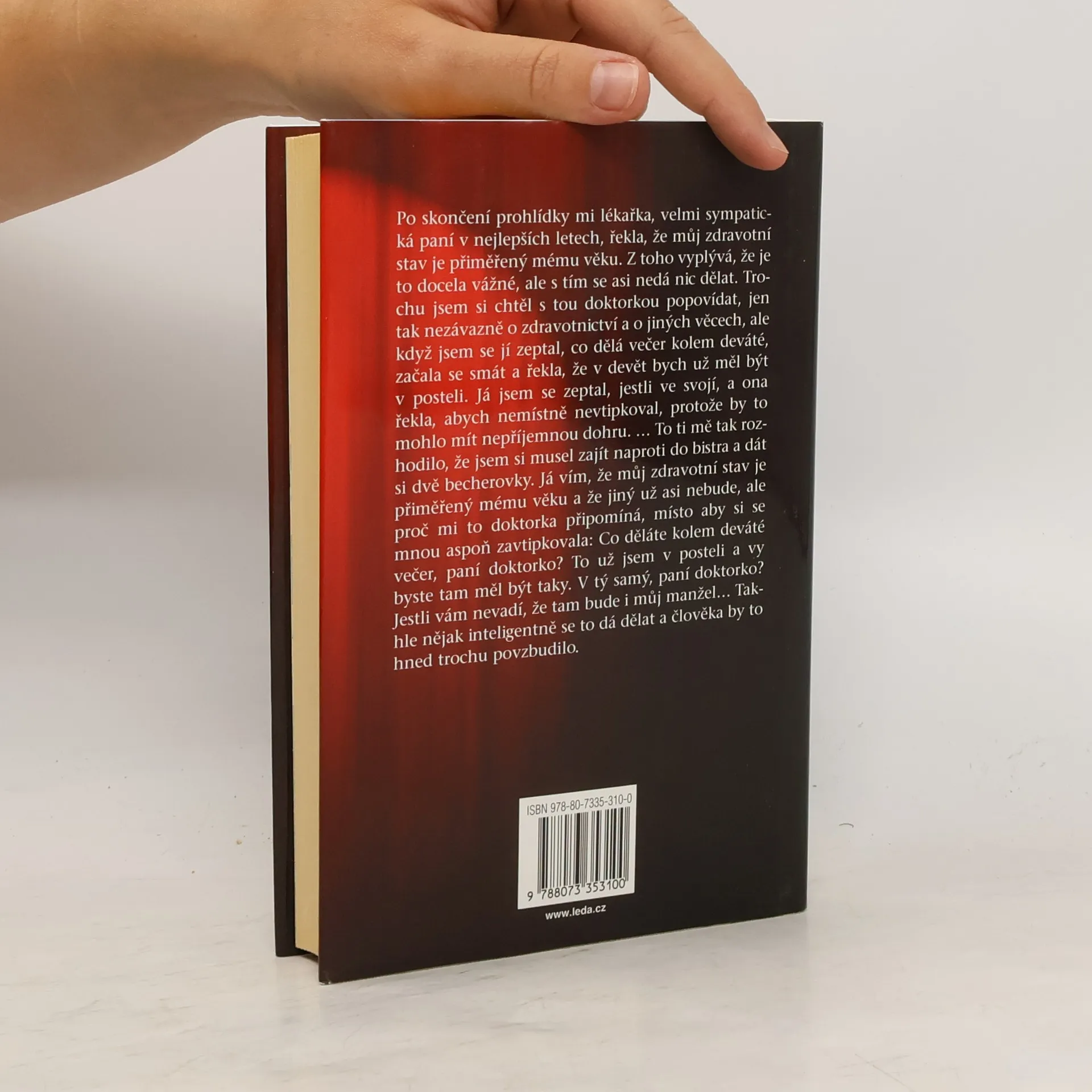 Po skončení prohlídky mi lékařka, velmi sympatická paní v nejlepších letech, řekla, že můj zdravotní stav je přiměřený mému věku. Z toho vyplývá, že je to docela vážné, ale s tím se asi nedá nic dělat. Trochu jsem si chtěl s tou doktorkou popovídat, jen tak nezávazně o zdravotnictví a o jiných věcech, ale když jsem se jí zeptal, co dělá večer kolem deváté, začala se smát a řekla, že v devět bych už měl být v posteli. Já jsem se zeptal, jestli ve svojí, a ona řekla, abych nemístně nevtipkoval, protože by to mohlo mít nepříjemnou dohru. … To ti mě tak rozhodilo, že jsem si musel zajít naproti do bistra a dát si dvě becherovky. Já vím, že můj zdravotní stav je přiměřený mému věku a že jiný už asi nebude, ale proč mi to doktorka připomíná, místo aby si se mnou aspoň zavtipkovala: Co děláte kolem deváté večer, paní doktorko? To už jsem v posteli a vy byste tam měl být taky. V tý samý, paní doktorko? Jestli vám nevadí, že tam bude i můj manžel… Takhle nějak inteligentně se to dá dělat a člověka by to hned trochu povzbudilo.