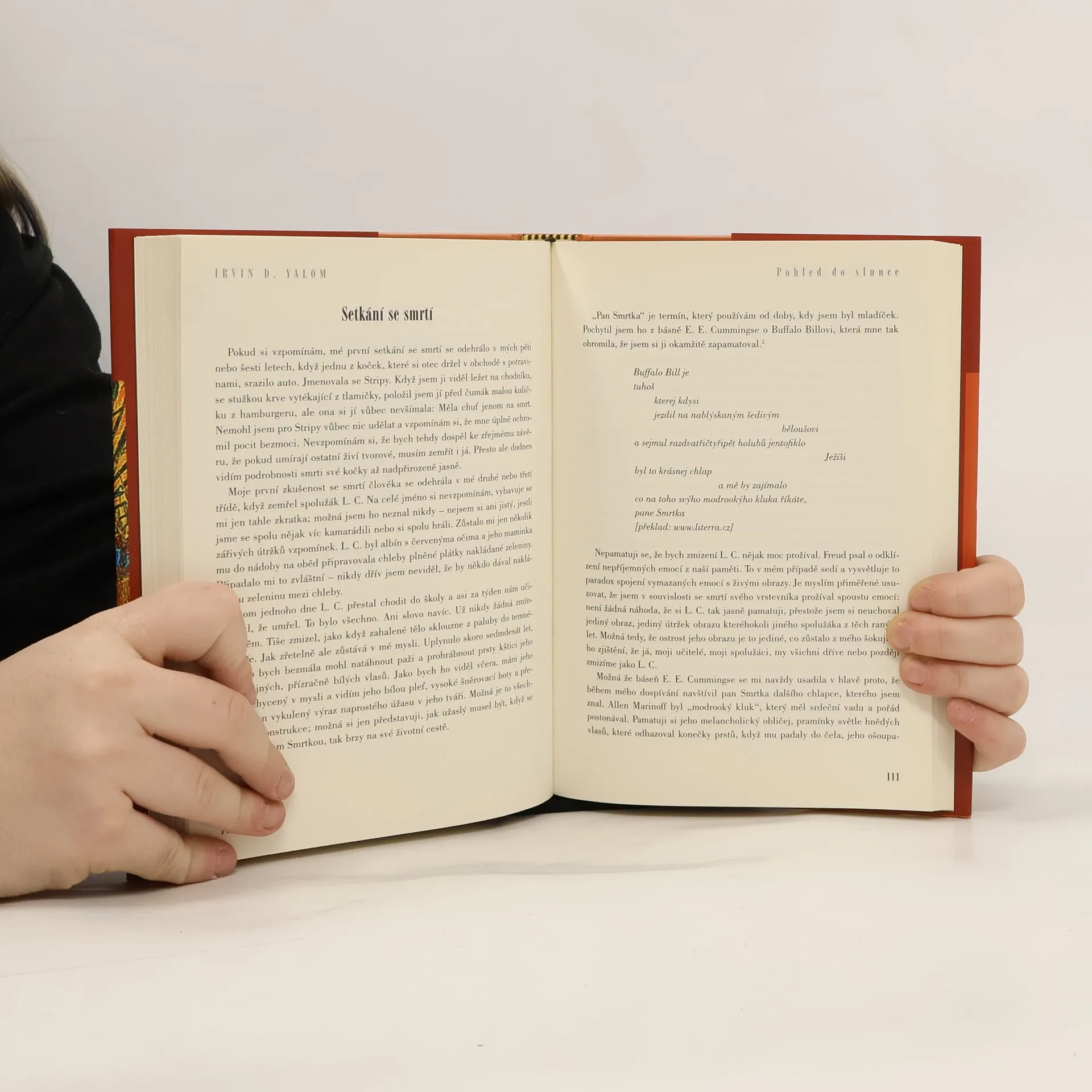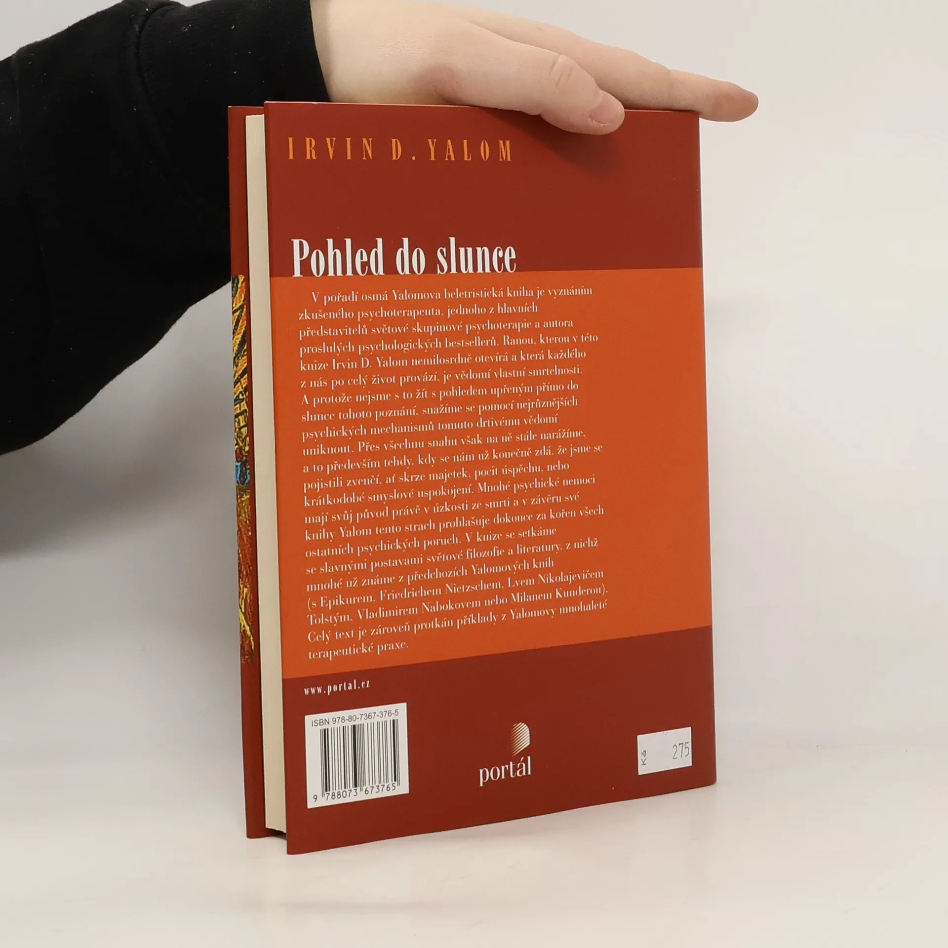 S podtitulem: O překonávání strachu ze smrti. Ranou, kterou ve své osmé beletristické knize psychoterapeut I. D. Yalom otevírá, a která každého z nás po celý život provází, je vědomí vlastní smrtelnosti. A protože nejsme s to žít s pohledem upřeným přímo do slunce tohoto poznání, pomocí nejrůznějších psychických mechanismů se tomuto drtivému vědomí snažíme uniknout. Přes všechnu snahu však na ně stále narážíme, a to zvláště tehdy, kdy se nám zdá, že jsme se pojistili zvenčí, ať skrze majetek, pocit úspěchu, nebo krátkodobé smyslové uspokojení. Mnohé psychické nemoci mají svůj původ právě v úzkosti ze smrti. V knize se setkáme se slavnými postavami filozofie a literatury, text je protkán příklady z Yalomovy praxe.
