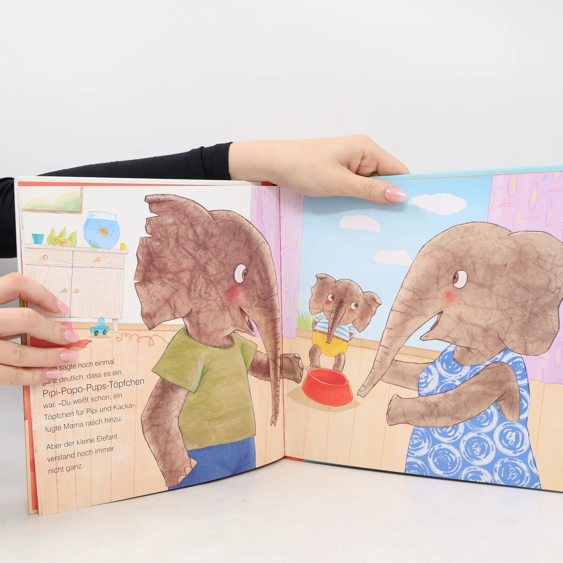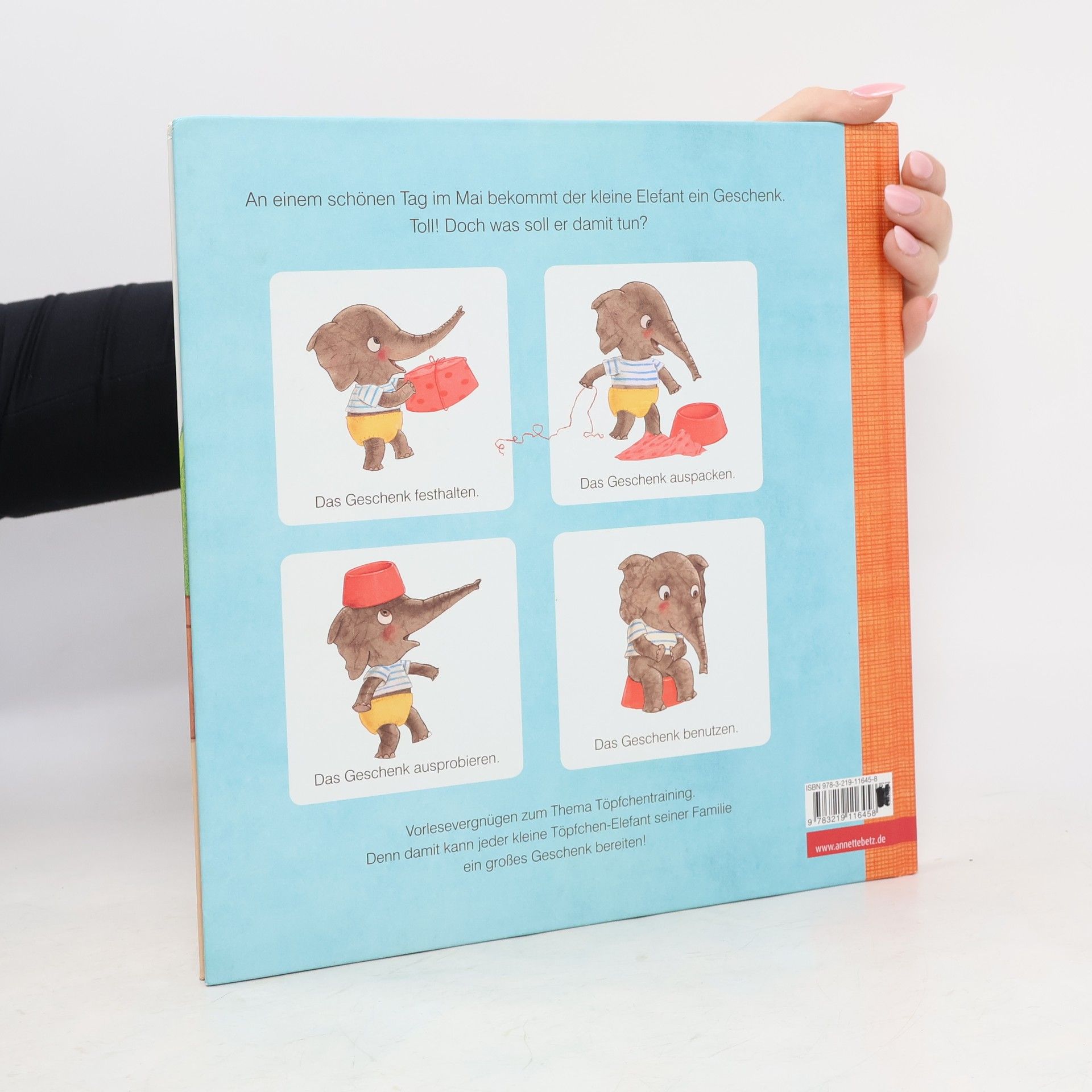Ein Hut, ein Lenkrad? – Nein, ein Töpfchen! Der kleine Elefant bekommt ein kleines Geschenk. Toll! Aber was ist es? Vielleicht ein Hut, den man aufsetzt, wenn es regnet? Oder das Lenkrad von einem Rennauto? Es könnte auch ein neues Schwimmbad für Igor, den Fisch sein? 'Aber nein!', sagt Papa. Es ist natürlich ein Pipi-Popo-Pups-Töpfchen! – Ach so! Bald benutzt der kleine Elefant es schon ganz allein. Was für ein großartiges Geschenk!
