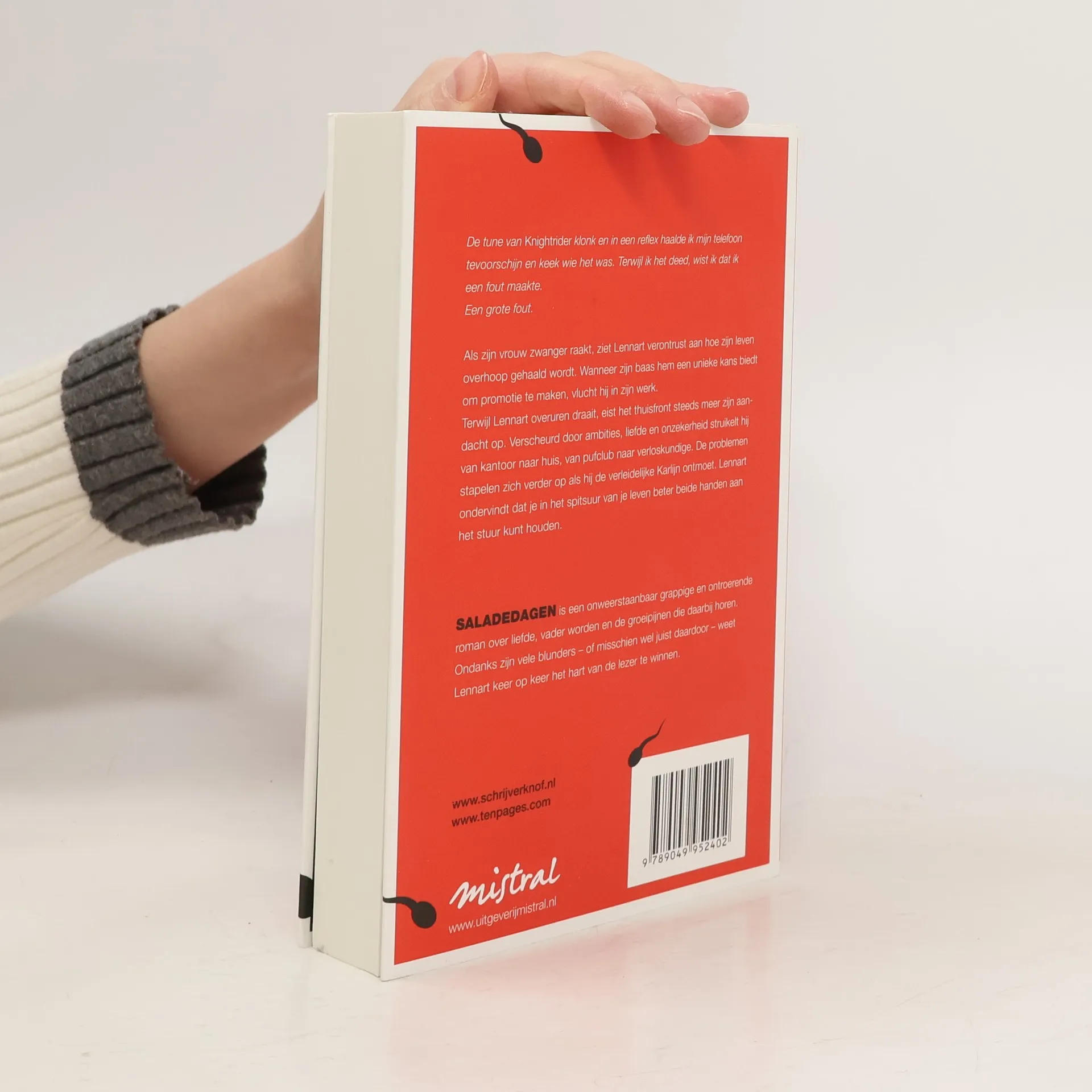 De tune van Knightrider klonk en in een reflex haalde ik mijn telefoon tevoorschijn en keek wie het was. Terwijl ik het deed, wist ik dat ik een fout maakte. Een grote fout. Als zijn vrouw zwanger raakt, ziet Lennart verontrust aan hoe zijn leven overhoop gehaald wordt. Wanneer zijn baas hem een unieke kans biedt om promotie te maken, vlucht hij in zijn werk. Terwijl Lennart overuren draait, eist het thuisfront steeds meer zijn aandacht op. Verscheurd door ambities, liefde en onzekerheid struikelt hij van kantoor naar huis, naar verloskundige. De problemen stapelen zich verder op als hij de verleidelijke Karlijn ontmoet. Lennart ondervindt dat je in het spitsuur van je leven beter beide handen aan het stuur kunt houden. SALADEDAGEN is een onweerstaanbaar grappige en ontroerende roman over liefde, vader worden en de groeipijnen die daarbij horen. Ondanks zijn vele blunders – of misschien wel juist daardoor – weet Lennart keer op keer het hart van de lezer te winnen.