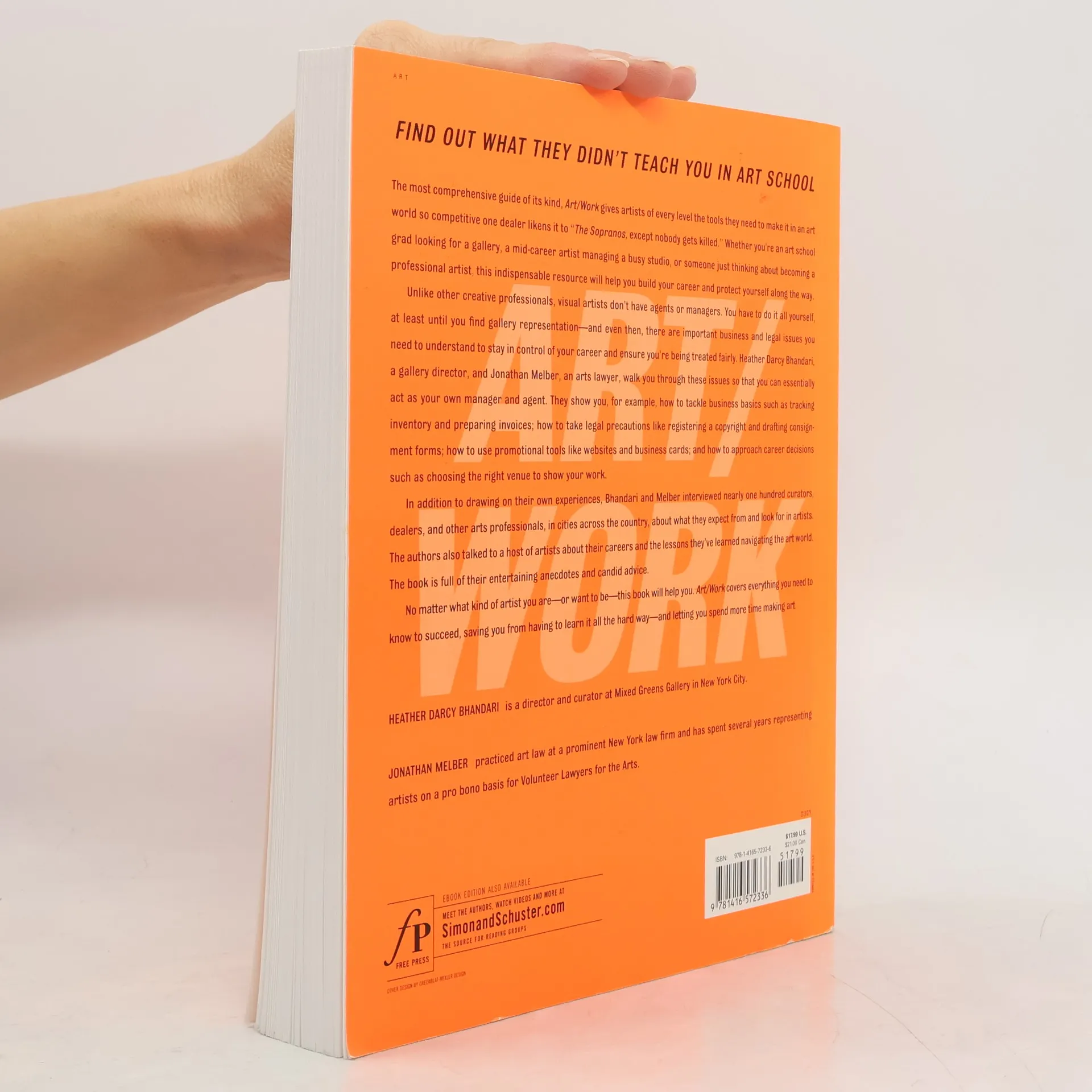 Find Out What They Didn't Teach You in Art SchoolThe most comprehensive guide of its kind, Art/Work gives artists of every level the tools they need to make it in an art world so competitive one dealer likens it to "The Sopranos, except nobody gets killed." Whether you're an art school grad looking for a gallery, a mid-career artist managing a busy studio, or someone just thinking about becoming a professional artist, this indispensable resource will help you build your career and protect yourself along the way.Unlike other creative professionals, visual artists don't have agents or managers. You have to do it all yourself, at least until you find gallery representation -- and even then, there are important business and legal issues you need to understand to stay in control of your career and ensure you're being treated fairly. Heather Darcy Bhandari, a gallery director, and Jonathan Melber, an arts lawyer, walk you through these issues so that you can essentially act as your own manager and agent. They show you, for example, how to tackle business basics such as tracking inventory and preparing invoices; how to take legal precautions like registering a copyright and drafting consignment forms; how to use promotional tools like websites and business cards; and how to approach career decisions such as choosing the right venue to show your work.In addition to drawing on their own experiences, Bhandari and Melber interviewed nearly one hundred curators, dealers, and other arts professionals, in cities across the country, about what they expect from and look for in artists. The authors also talked to a host of artists about their careers and the lessons they've learned navigating the art world. The book is full of their entertaining anecdotes and candid advice.No matter what kind of artist you are -- or want to be -- this book will help you. Art/Work covers everything you need to know to succeed, saving you from having to learn it all the hard way -- and letting you spend more time making art.