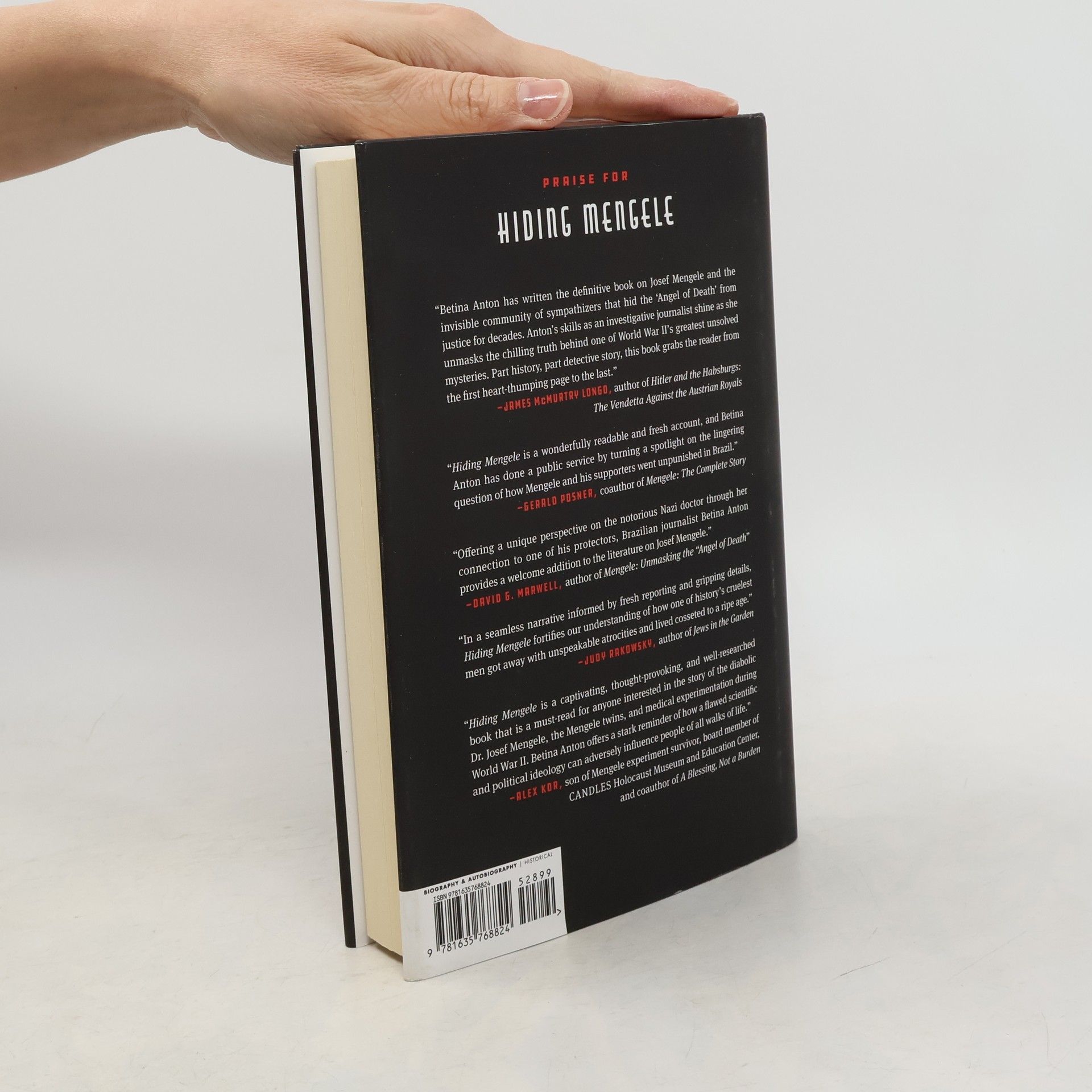 A Brazilian journalist's investigation unearths the story of a network of people responsible for hiding "The Angel of Death," the infamous Nazi doctor who fled to South America and escaped justice for over thirty years. After the end of World War II, Josef Mengele, known worldwide for unimaginably cruel human experiments and for sending thousands of people to the gas chambers at Auschwitz. He was a fugitive for thirty-four years, more than half of them in Brazil, sought by the Israeli secret service and Nazi hunters until his death in Bertioga in 1979. Hidden in Brazil, Mengele created his own paradise, a life where he could speak German, maintain his beliefs, his friends, and his connection with the homeland. It was only possible thanks to a small circle of expatriate Europeans willing to help him until the end. One such person was Austrian ex-pat Liselotte Bossert, who buried Mengele with false documents to keep his true identity hidden even after his death. When the world finally discovered where the remains of Josef Mengele were in 1985, Liselotte was a kindergarten teacher at a German school in São Paulo. She was escorted from the premises without further explanation to the students. One six-year-old student, Betina Anton, could not let this mystery go. Decades later as an experienced journalist, Betina decided to investigate, but when she found Liselotte, she could not imagine how deep this case would take her. Translated from the Portuguese and based on extensive research, including interviews, unpublished documents, and news coverage from that era, Hiding Mengele is a suspenseful narrative not only haunted by the doctor's horrific experiments, but also by the motivations driving a community to protect one of the most evil people known to mankind.