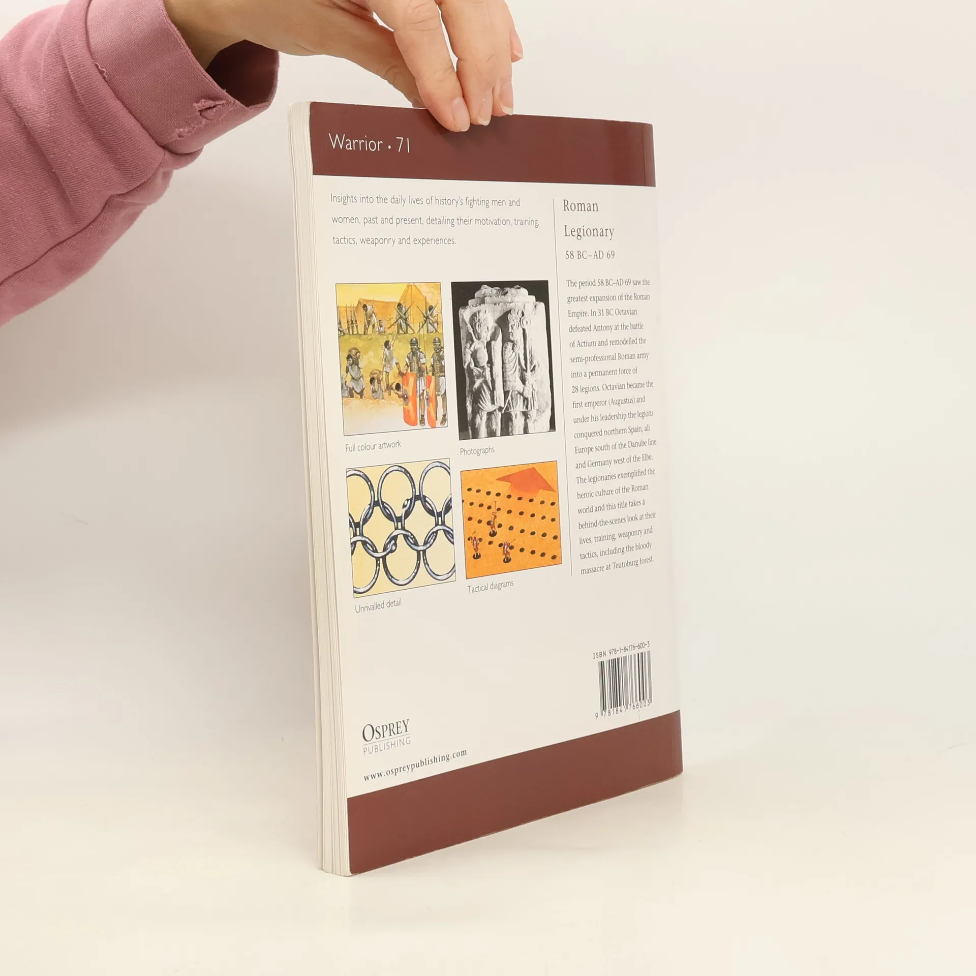 The period 31 BC-AD 43 saw the greatest expansion of the Roman Empire. In 31 BC Octavian defeated Antony at the battle of Actium and remodelled the semi-professional Roman army into a permanent force of 28 legions. Octavian became the first emperor (Augustus) and under his leadership the legions conquered northern Spain, all Europe south of the Danube line and Germany west of the Elbe. The legionaries exemplified the heroic culture of the Roman world and this title takes a behind-the-scenes look at their lives, training, weaponry and tactics, including the bloody massacre of the Teutoberg forest.