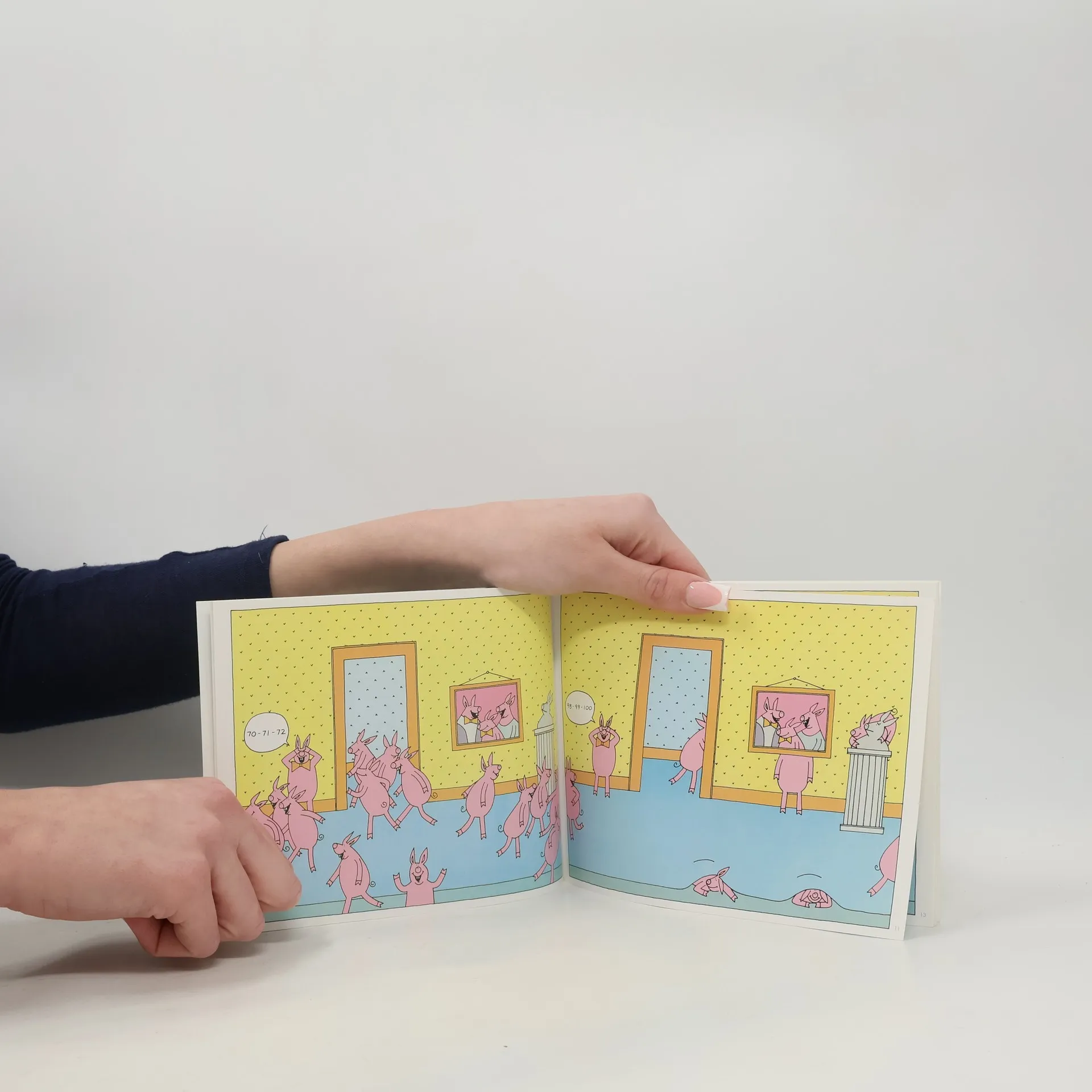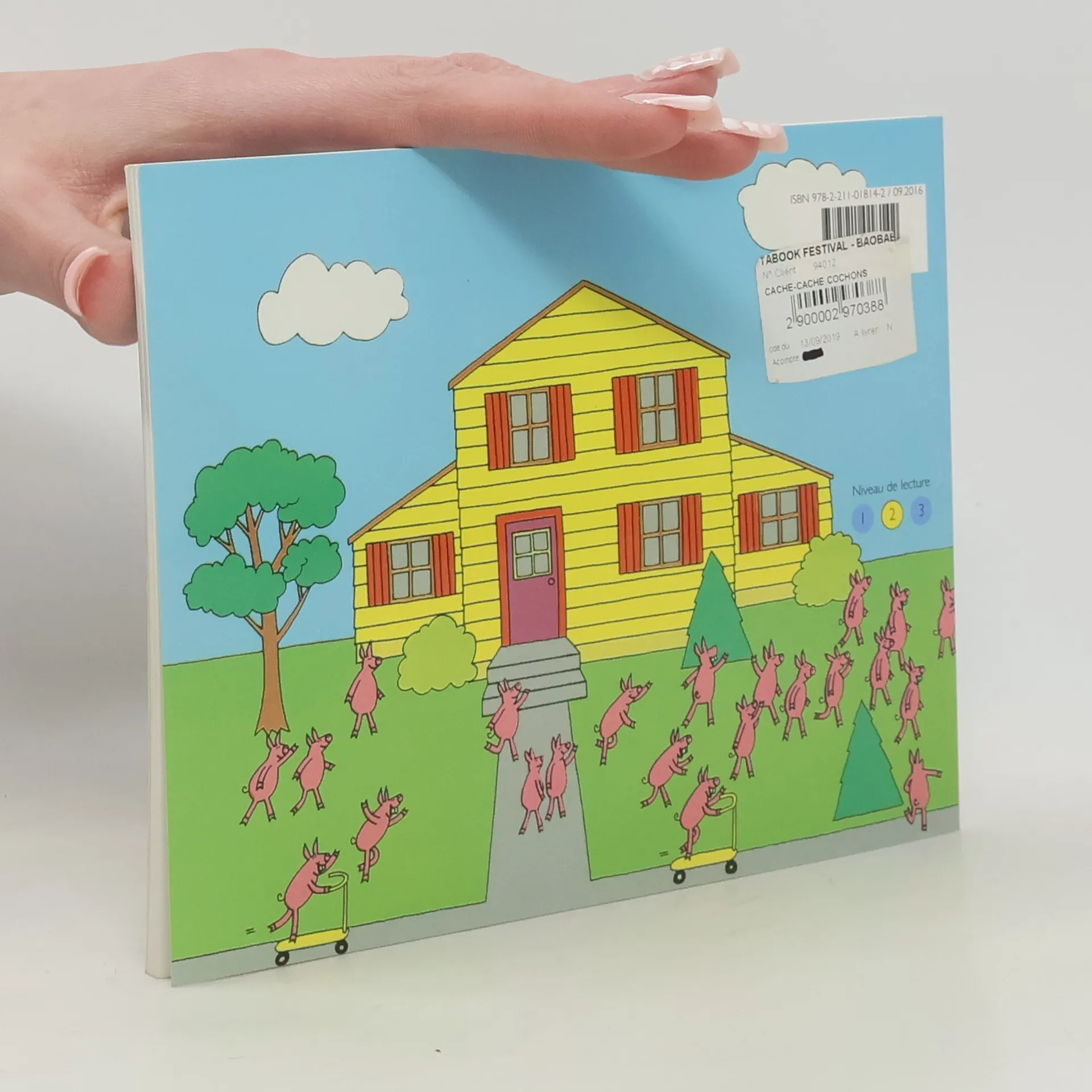 A game of hide-and-seek played by a number of pigs allows the reader to find the animals in their hiding places.