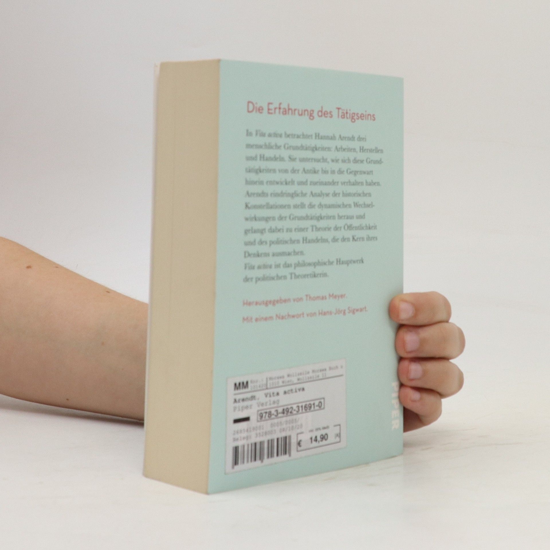 WAS TUN, WENN WIR TÄTIG SIND? » Vita activa « im ursprüngliche Sinne meint Arbeiten, Herstellen und Handeln . Hannah Arendts umfassende Analyse gilt vor allem diesen drei Grundtätigkeiten. Sie untersucht darüber hinaus, wie sie sich im Laufe der Geschichte bis in die Neuzeit hinein zu verhalten haben. Hannah Arendts Auseinandersetzung mit dem Fetisch Arbeit und Konsum in der modernen Arbeitsgesellschaft im Zusammenhang mit dem Niedergang einer Kultur der politischen Öffentlichkeit bildet den Kern ihrer politischen Theorie. Kurt Sontheimer schrieb dazu: »Der Philosophie als einer theoretischen, auf die reine Erkenntnis der Natur gerichteten Disziplin stellte sie die Politik als die Sphäre der Praxis, als das Reich handelnder Menschen gegenüber.« Vita activa ist das philosophische Hauptwerk der politischen Theoretikerin.