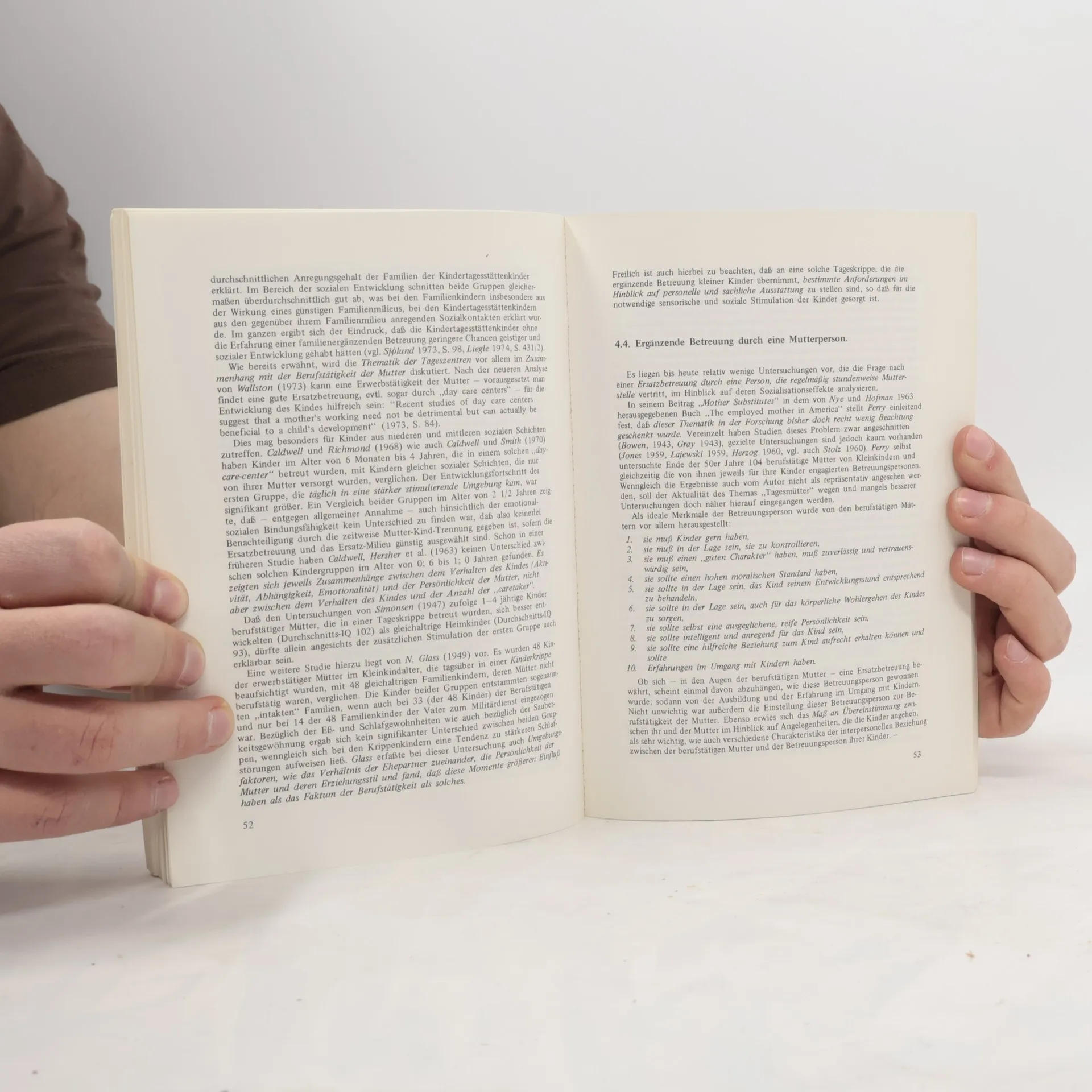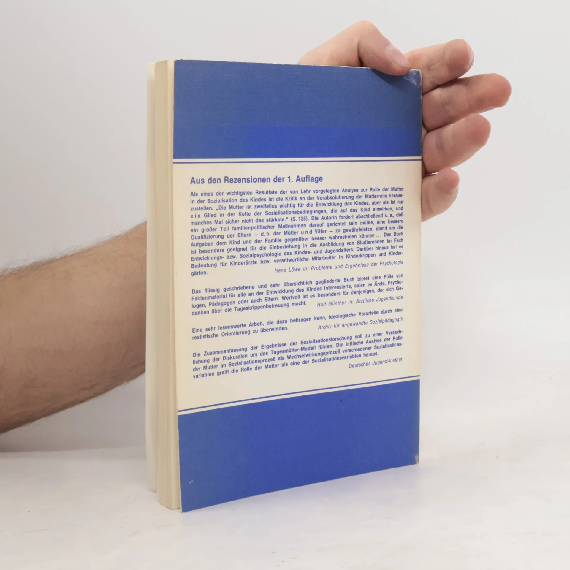 Inhaltsverzeichnis: 1. Einleitung: Begriff der Sozialisation, Theorien und Modelle, Sozialisationsvariablen, Mutter-Kind-Beziehung in der Forschung. 2. Verhalten der Mutter in Ernährungssituationen und Sozialisationseffekte: Bedeutung der oralen Phase, empirische Ergebnisse zum Ernährungsverhalten, multivariate Forschungsansätze. 3. Mutter-Kind-Beziehung in der Hospitalismusforschung: Probleme der Trennung, Einflussfaktoren, sensorische und soziale Stimulation. 4. Ergänzende Betreuung bei mütterlicher Abwesenheit: Vergleich mit Heimkindern, Kibbutz-Forschung, Tageskrippen, Betreuung durch „Mutterpersonen“, Erfahrungen in Frankreich, Schweden, Dänemark. 5. Mütterliche Berufstätigkeit und Auswirkungen auf das Kind: Forschungslage, Verbreitung, Betreuung berufstätiger Mütter, Einstellung zur Berufstätigkeit, Methodenprobleme, Effekte auf Schulleistung, Intelligenz, Persönlichkeitsentwicklung, Verhaltensauffälligkeiten, Rollenverständnis, Zufriedenheit der Mütter. 6. Mütterliches Erziehungsverhalten und Persönlichkeitsentwicklung: Methodische Ansätze, Dimensionen des Erziehungsverhaltens. 7. Rolle des Vaters und Auswirkungen auf die Sozialisation: Vernachlässigung in der Forschung, Vater-Kind-Trennung, differenzierende Betrachtung. 8. Zusammenfassende Schlussbetrachtung. Literatur und Anmerkungen zu Kapitel 4.5.