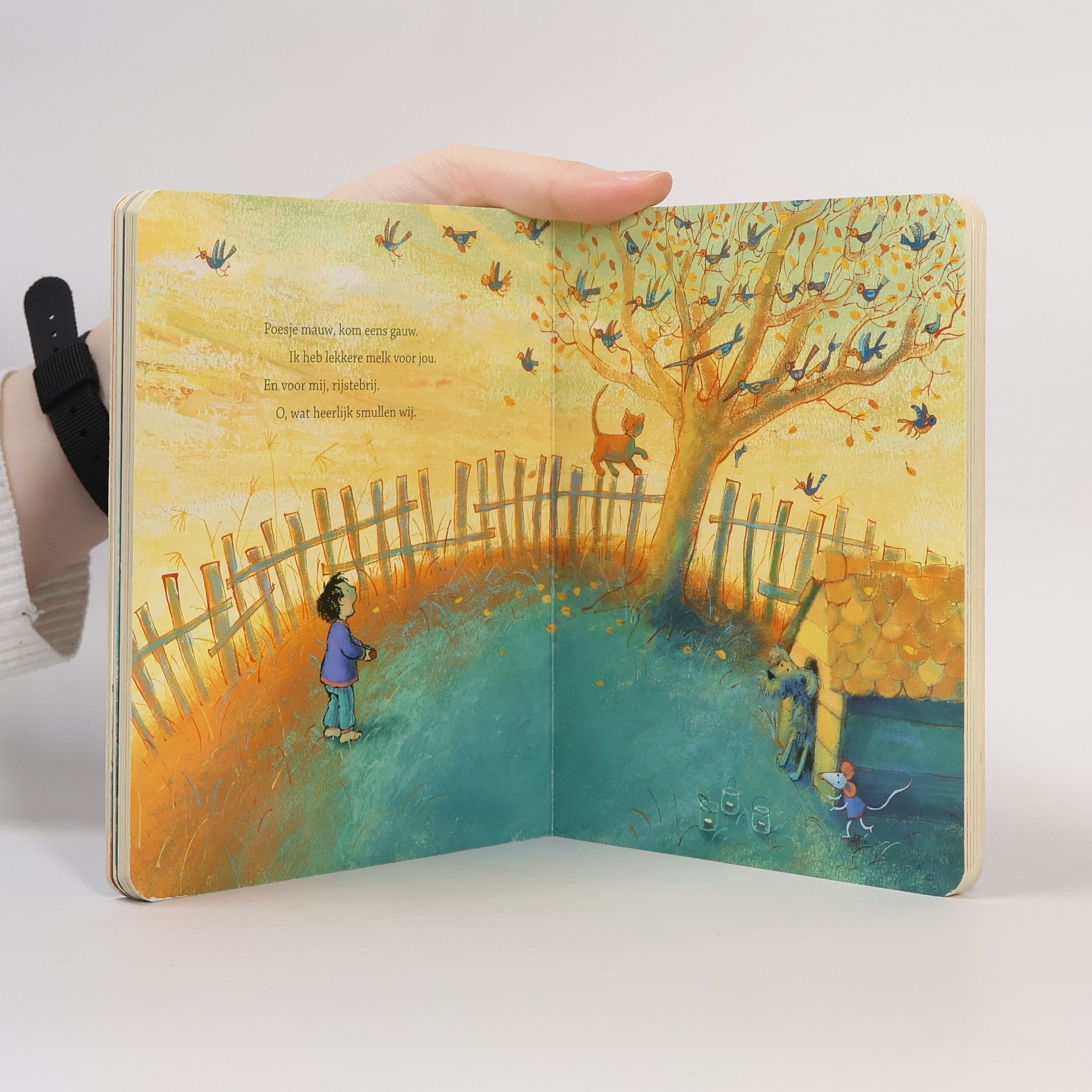 Liedteksten van twaalf bekende kinderliedjes zoals 'Klap eens in je handjes' en 'Poesje mauw'. Hardkartonnen prentenboek met paginagrote illustraties in warme kleuren. Vanaf ca. 1 jaar.