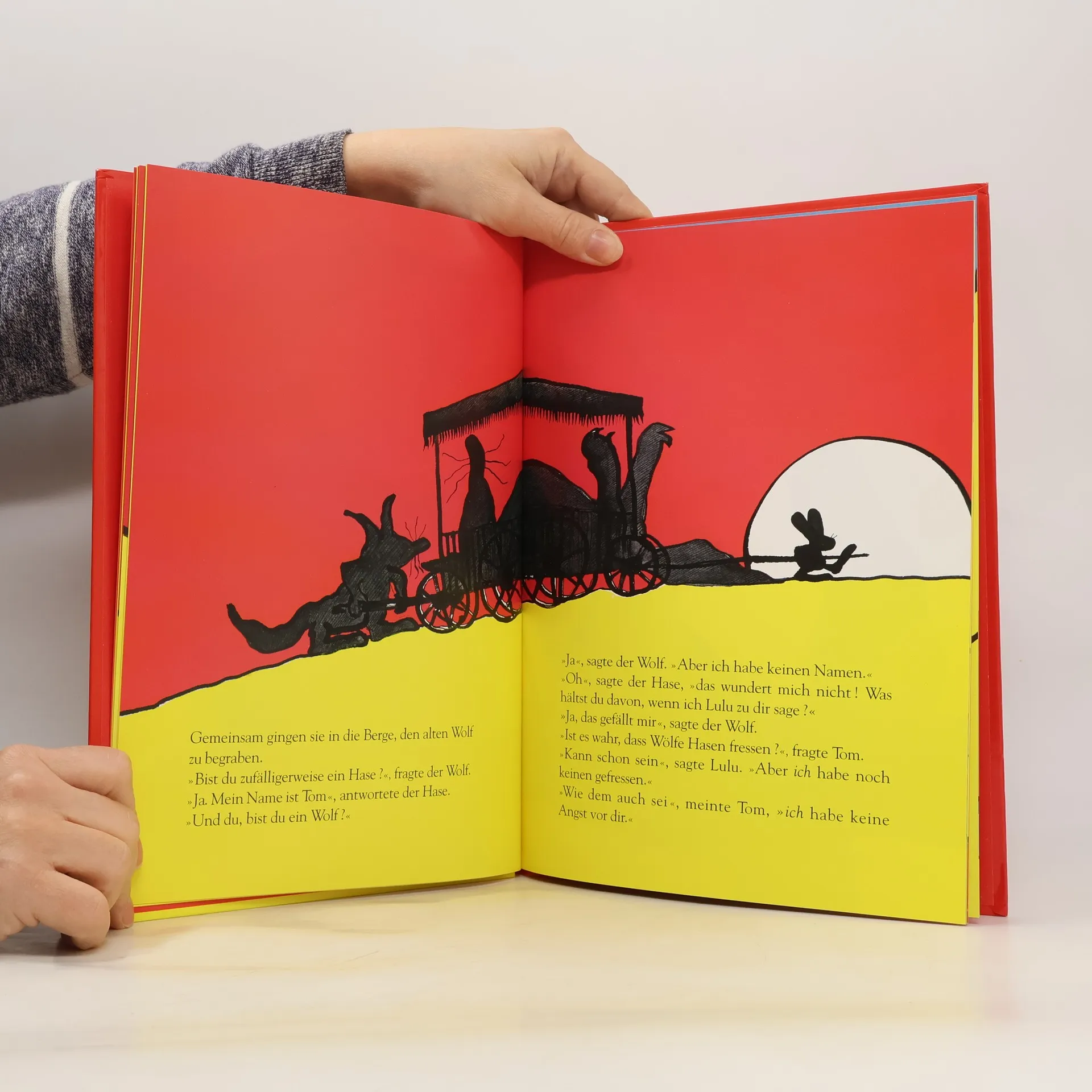 Ein Bilderbuch über Freundschaft und Angst, über einen Hasen und einen Wolf und darüber, welche Erschütterungen Freundschaften manchmal aushalten müssen. Wenn ein kleiner Wolf noch nie einen Hasen gesehen hat und ein kleiner Hase noch nie einen Wolf, können beide auch nicht wissen, vor wem sie Angst haben oder wen sie jagen sollen. Auch Tom und Lulu geht es so - also werden sie Freunde, bringen sich gegenseitig nützliche Dinge bei und gehen gemeinsam angeln. Erst beim "Angst-vor-dem-Wolf"-Spielen, bekommt Hase Tom so große Angst vor Wolf Lulu, d er nichts mehr von ihm wissen will und die Freundschaft aufkündigt. Lulu muss gehen, doch als auch er es in der Fremde mit der Angst zu tun bekommt, versteht er Tom und kehrt zu ihm zurück. So siegt die Freundschaft über ihre Angst. Ein Bilderbuch voller Kontraste und Farben, voller Perspektiven und Details, das in Frankreich ein moderner Bilderbuchkliker wurde und in Spielfilmlänge verfilmt wurde.