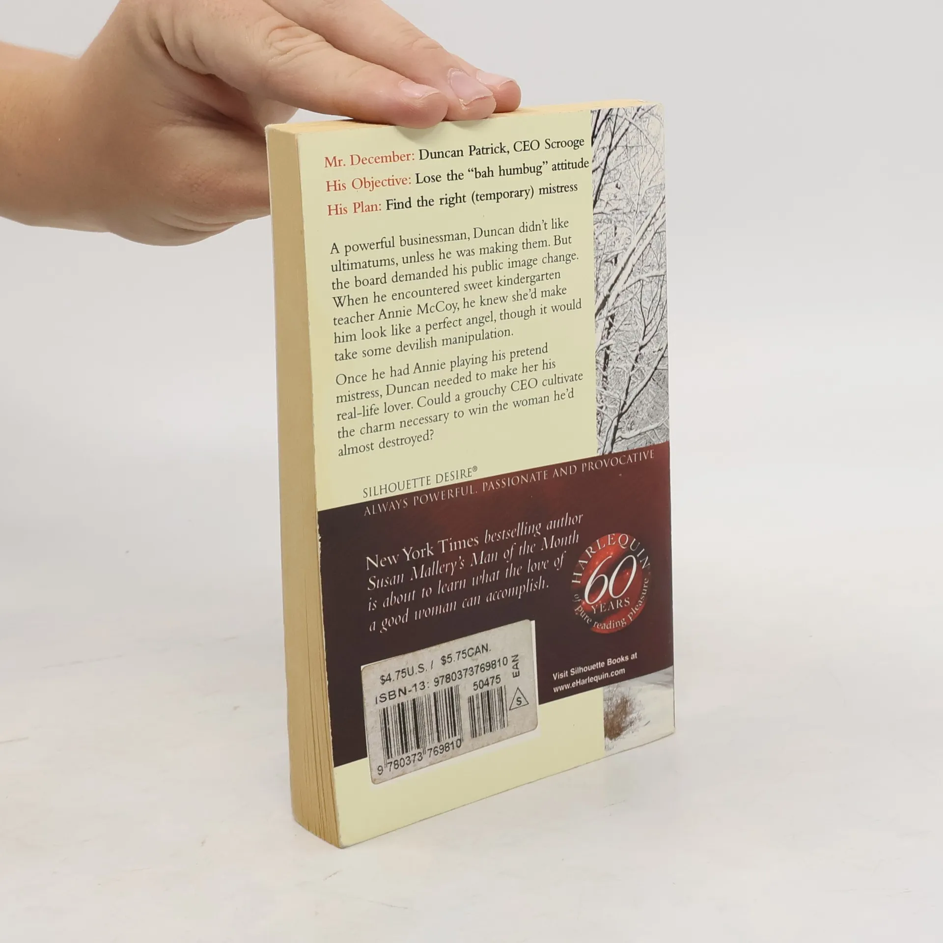 Mr. Duncan Patrick, CEO ScroogeHis Lose the "bah humbug" attitudeHis Find the right (temporary) mistressA powerful businessman, Duncan didn't like ultimatums, unless he was making them. But the board demanded his public image change. When he encountered sweet kindergarten teacher Annie McCoy, he knew she'd make him look like a perfect angel, though it would take some devilish manipulation.Once he had Annie playing his pretend mistress, Duncan needed to make her his real-life lover. Could a grouchy CEO cultivate the charm necessary to win the woman he'd almost destroyed?