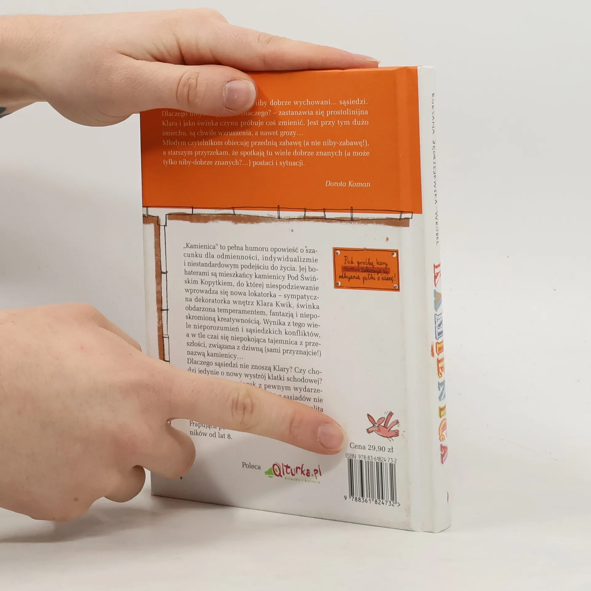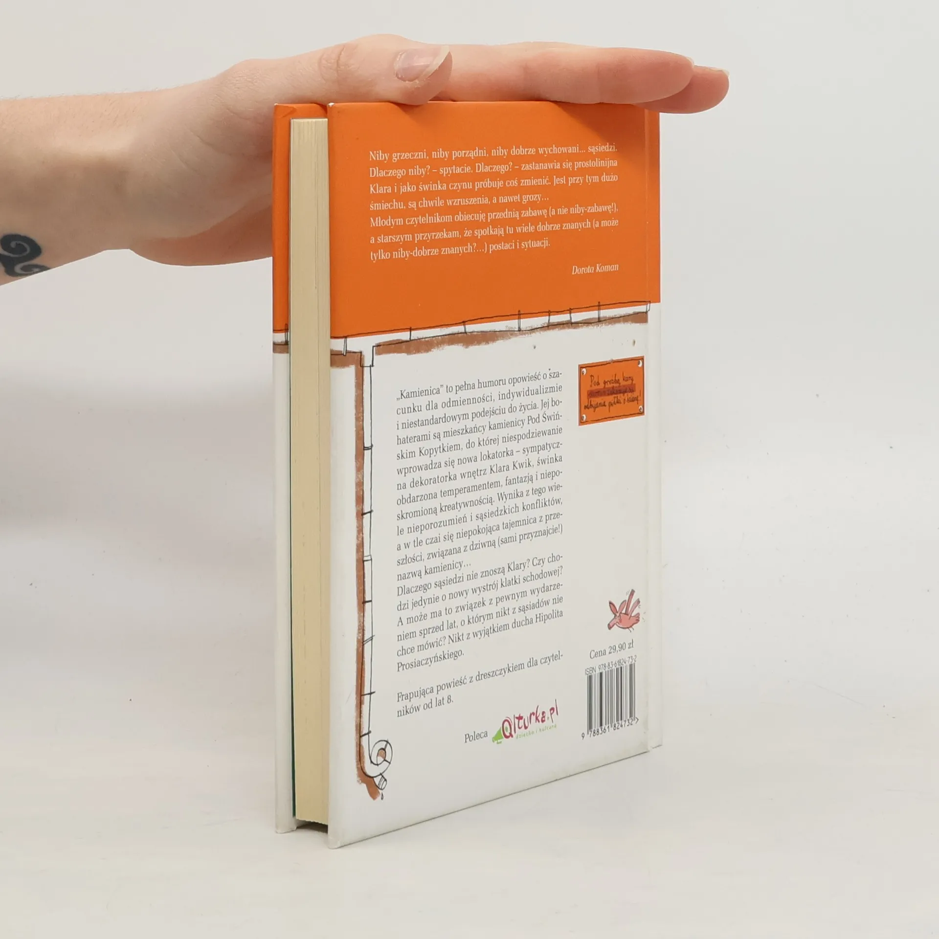 Tajemnica kamienicy Pod Świńskim KopytkiemPewnego dnia do kamienicy Pod Świńskim Kopytkiem niespodziewanie wprowadza się nowa lokatorka – sympatyczna dekoratorka wnętrz Klara Kwik, świnka obdarzona temperamentem, fantazją i nieposkromioną kreatywnością. Wynika z tego wiele nieporozumień i sąsiedzkich konfliktów, a w tle czai się niepokojąca tajemnica z przeszłości, związana z dziwną (sami przyznajcie!) nazwą kamienicy...Dlaczego sąsiedzi nie znoszą Klary? Czy chodzi tylko o nowy wystrój klatki schodowej? A może ma to związek z pewnym wydarzeniem sprzed lat, o którym nikt z sąsiadów nie chce mówić? Nikt z wyjątkiem ducha Hipolita Prosiaczyńskiego.Frapująca powieść z dreszczykiem dla czytelników od lat 8, będąca jednocześnie pełną humoru opowieścią o szacunku dla odmienności, indywidualizmie i niestandardowym podejściu do życia.