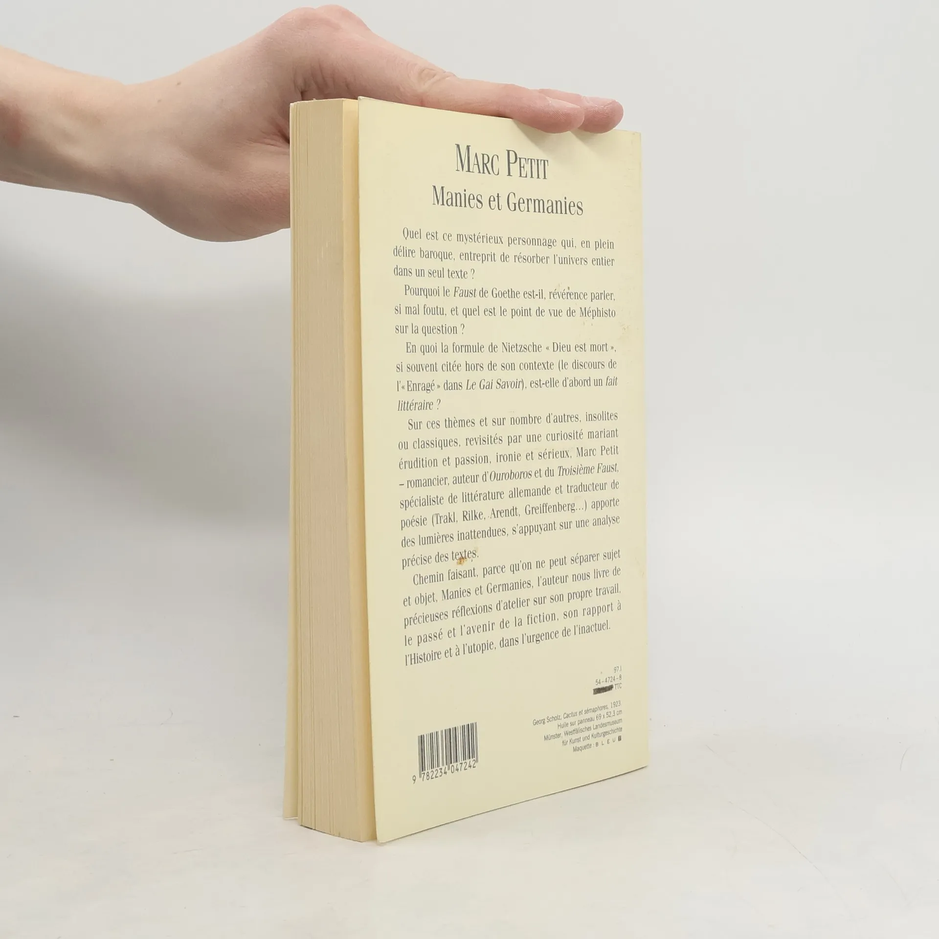 Quel est ce mystérieux personnage qui, en plein délire baroque, entreprit de résorber l'univers entier dans un seul texte ? Pourquoi le Faust de Goethe est-il, révérence parler, si mal foutu, et quel est le point de vue de Méphisto sur la question ? En quoi la formule de Nietzsche Dieu est mort, si souvent citée hors de son contexte (le discours de l'Enragé dans Le Gai Savoir), est-elle d'abord un fait littéraire ? Sur ces thèmes et sur nombre d'autres, insolites ou classiques, revisités par une curiosité mariant érudition et passion, ironie et sérieux, Marc Petit – romancier, auteur d'Ouroboros et du Troisième Faust, spécialiste de littérature allemande et traducteur de poésie (Trakl, Rilke, Arendt, Greiffenberg...) apporte des lumières inattendues, s'appuyant sur une analyse précise des textes. Chemin faisant, parce qu'on ne peut séparer sujet et objet, Manies et germanies, l'auteur nous livre de précieuses réflexions d'atelier sur son propre travail, le passé et l'avenir de la fiction, son rapport à l'Histoire et à l'utopie, dans l'urgence de l'inactuel.
