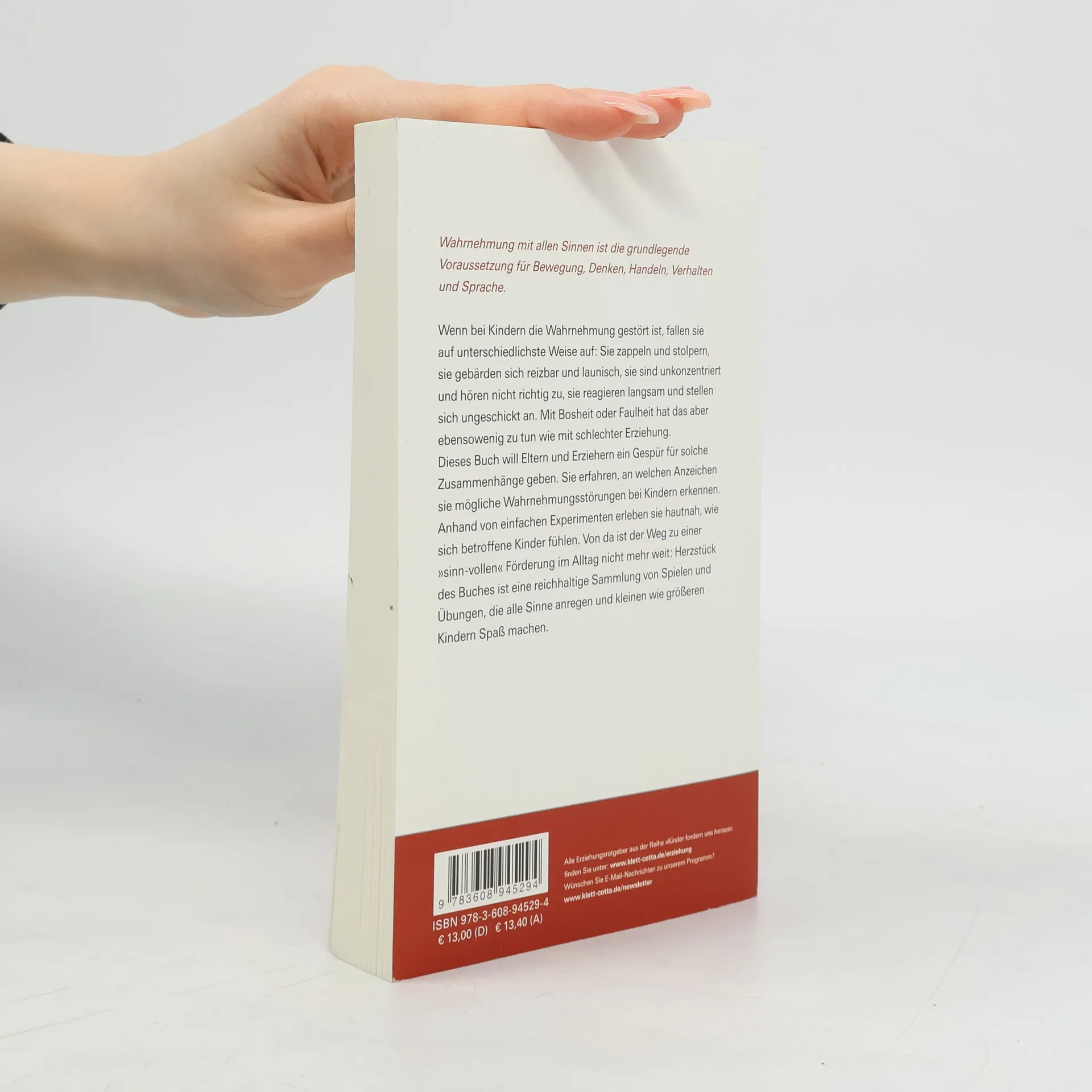 Haben Kinder erst einmal eine Wahrnehmungsstörung entwickelt, so fallen sie auf unterschiedlichste Weise auf: Sie zappeln und stolpern, sie gebärden sich reizbar und launisch, sie reagieren langsam und sind ungeschickt. Die reichhaltige Sammlung von Spielen und Übungen im Buch regt bei kleinen wie größeren Kindern alle Sinne an. Wahrnehmung mit allen Sinnen ist die grundlegende Voraussetzung für Bewegung, Denken, Handeln, Verhalten und Sprache. Der logische Schluß daraus: Wenn die Wahrnehmung gestört ist, äußert sich das durch Auffälligkeiten in der Bewegung, im sozialen Verhalten, in der Sprache, in den emotionalen Äußerungen. Mit Ungezogenheit, Bosheit oder Faulheit hat das ebenso wenig zu tun wie mit schlechter Erziehung. Dieses Buch will Eltern und Erziehern ein Gespür für solche Zusammenhänge geben. Sie erfahren, an welchen Anzeichen sie mögliche Wahrnehmungsstörungen bei Kindern erkennen. Anhand von einfachen Experimenten erleben sie hautnah, wie sich betroffene Kinder fühlen. Von da ist der Weg zu einer "sinnvollen" Förderung im Alltag nicht mehr weit. Nicht zuletzt stellt das Buch wichtige Hilfs- und Fördermöglichkeiten vor und führt eine Fülle von nützlichen Adressen an.