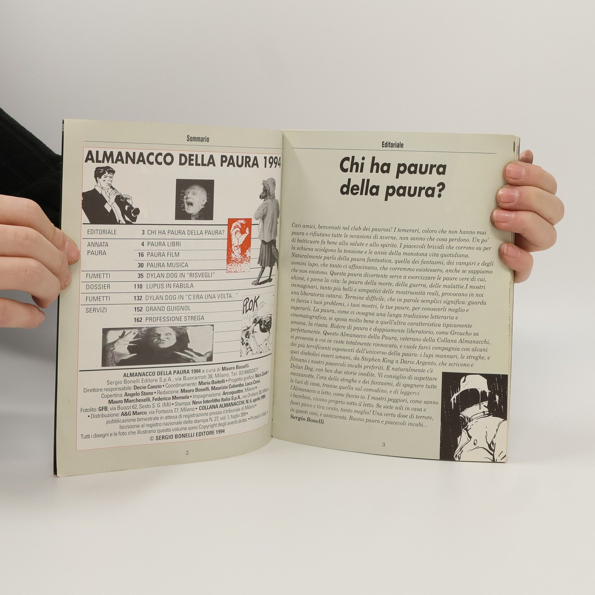 Dylan Dog in due nuovi episodi completi: “Risvegli” e “C’era una volta…”. Annata horror: tutto su libri, film, video, musica. Le streghe. Il Grand Guignol. Dossier licantropi: I figli della luna piena. 176 pagine di Orrore, Brivido, Terrore!RisvegliLa moglie, il marito e l’amante. Classico triangolo e classico complotto omicida. Sullo sfondo della campagna inglese, si muove, però, qualcosa di imprevisto; un essere senza forma, animato da una fame ancestrale, si risveglia dal suo lungo sonno… In una sola notte, Dylan incontrerà assassini maldestri, resurrezioni impossibili, tradimenti e doppi giochi. Una sarabanda noir pronta a dissolversi nelle viscere del mostro.C’era una volta…Cappuccetto Rosso attraversa il bosco seguita dal sussurro del vento notturno, un mostro sanguinario si muove alle sue spalle e attende l’occasione per divorarla. Per fortuna, ha incontrato Dylan Dog e, insieme a lui, può raggiungere sana e salva la casa della nonna… E trovare la morte!