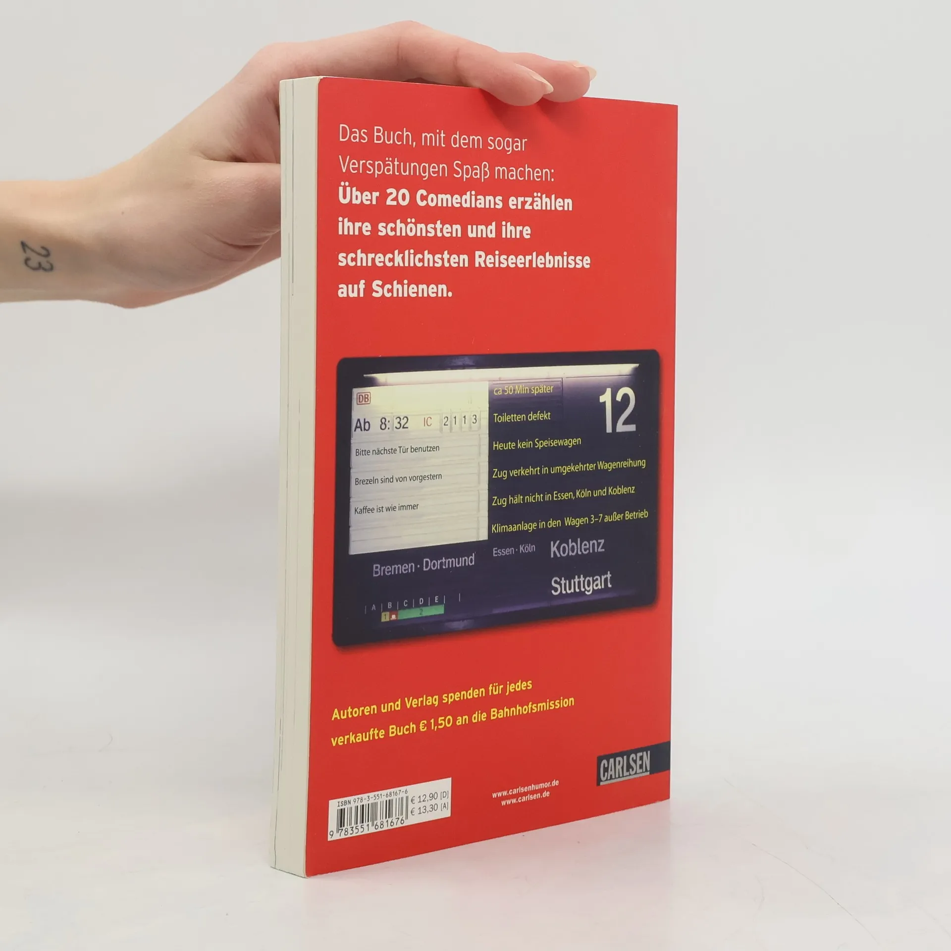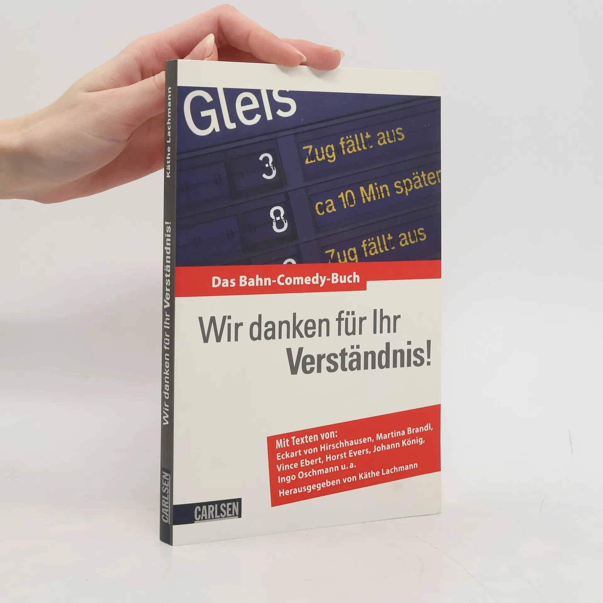 Comedians sind viel unterwegs, und meistens mit der Bahn. Über 20 Comedians erzählen ihre schönsten Reiseerlebnisse auf Schienen. Ein Buch, mit dem sogar Verspätungen Spaß machen. Und das Gutes tut: Pro Buch werden € 1,50 an die Bahnhofsmission gespendet. Herausgegeben von der Comedy-Künstlerin Käthe Lachmann. Für alle, die über die Bahn nur noch lachen können. Mit Texten von Eckart von Hirschhausen, Vince Ebert, Martina Brandl und vielen anderen.