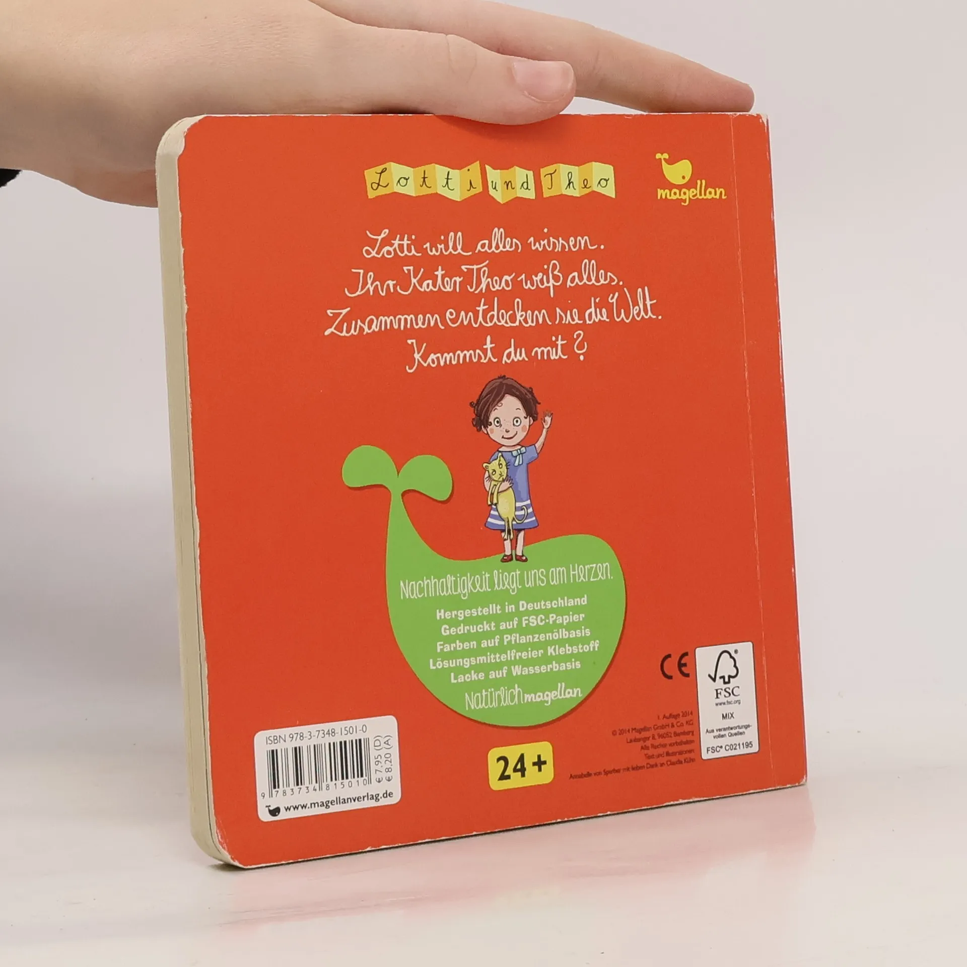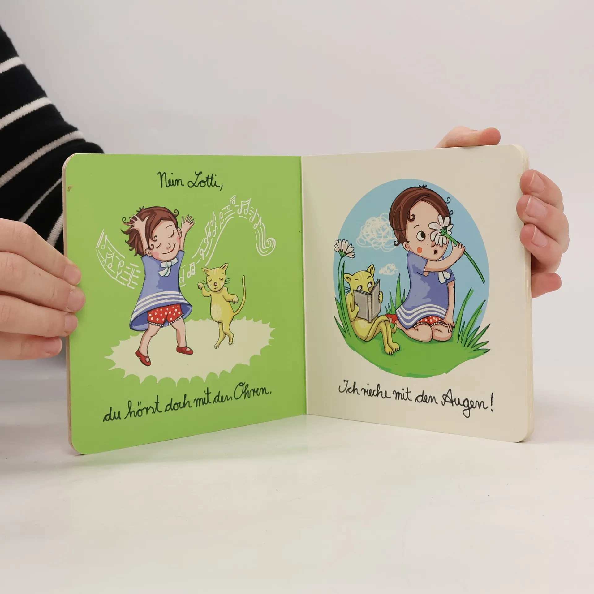 Lotti ist drei Jahre alt und will alles wissen. Ihr Kater Theo weiß alles und erklärt ihr die Welt. Zum Beispiel die Sinne: „Ich höre mit den Händen“, meint Lotti. „Nein, du hörst doch mit den Ohren“, weiß Theo. Mit wenigen Worten und klaren Bildern entwickelt sich ein Gespräch zwischen den beiden, das augenzwinkernd den Dialog zwischen Vorleser und Kind einbezieht.