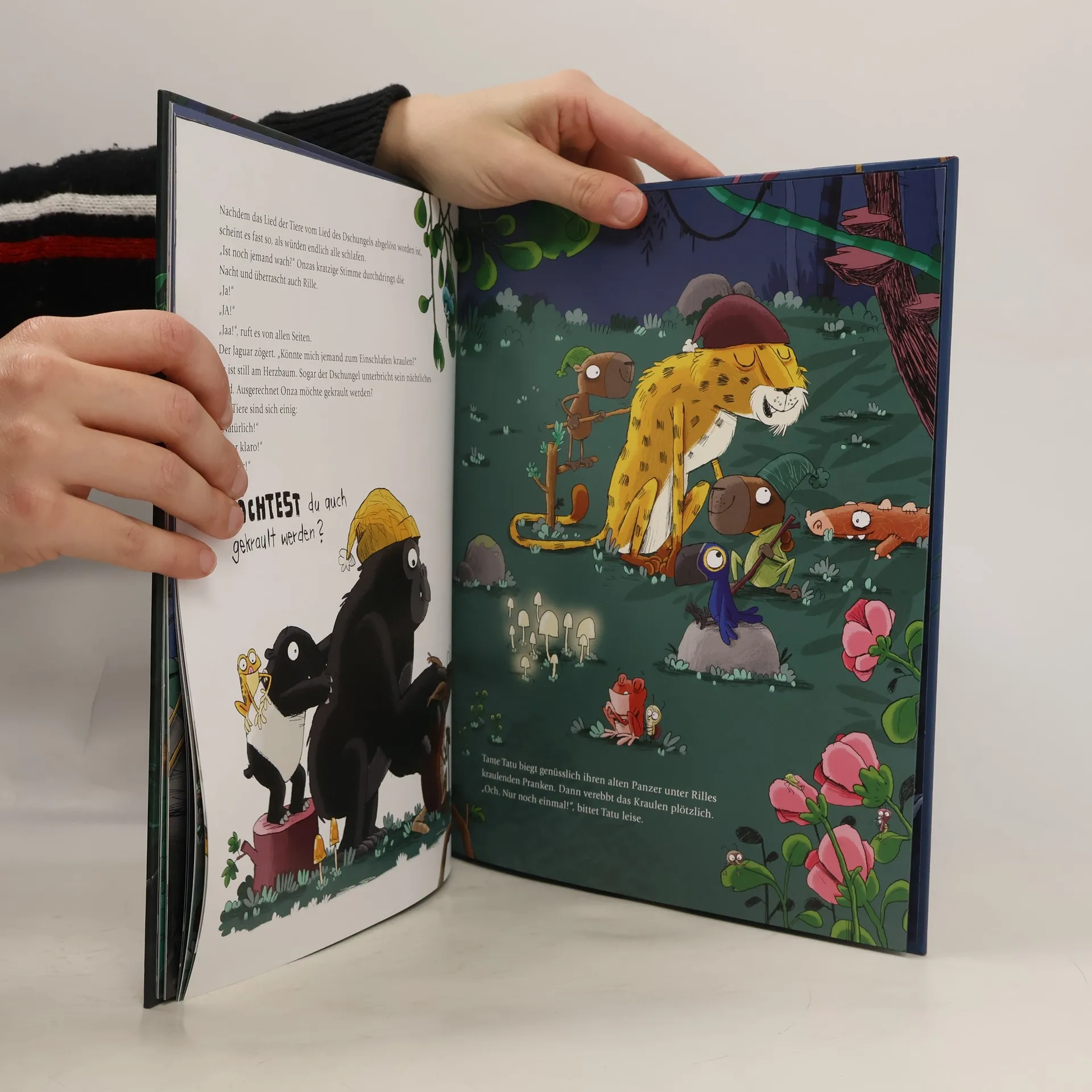 Manchmal ist es abends viel zu schön um schon zu schlafen! Abends zur Ruhe zu kommen ist manchmal ganz schön schwer. Auch Rille und seine Freunde Pepe, die Wasserschweine, Leopard Onza und die kleinen Pfeilgiftfrösche wollen noch nicht schlafen. Nur noch eine Geschichte vorlesen, nur noch ein einziges Gute-Nacht-Lied singen, nur noch einmal Pipi machen. Nur noch einmal! Tante Tatu hat ganz schön viel zu tun, bis alle Dschungeltiere zufrieden sind. Aber nach und nach werden dann doch noch alle müde, kuscheln sich im sanften Licht der Leuchtpilze zusammen und schlafen ein. Ein witziges Mitmach-Bilderbuch für Kinder ab 3 Jahren - mit vielen Tricks und Ritualen zum Einschlafen.