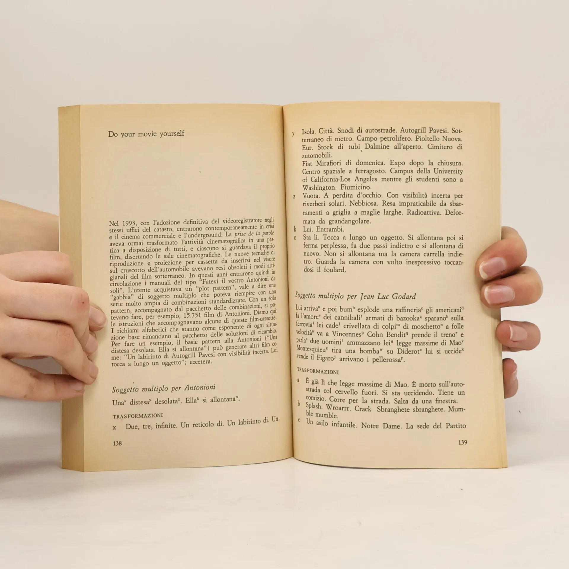 Soggetto multiplo per Ermanno Olmi Un tagliaboschi(a) disoccupato(b) vaga a lungo(c) poi torna al villaggio natio(d) e trova la mamma(e) morta(f). Passeggia nei boschi(g) parlando con un vagabondo(h), poi capisce(i) la bellezza degli alberi(l) e resta lì(m) a pensare(n). TRASFORMAZIONI a) Un giovane appena arrivato in città. Un ex partigiano. Un executive deluso. Un alpino. Un minatore. Un maestro di sci. b) Sovraoccupato. Triste. Che non ha più scopi. Malato. Licenziato. Colto da senso del vuoto. Che ha perduto la fede. Che ha riacquistato la fede. Dopo una visione di Papa Giovanni. c) Brevemente. Guida su autostrada una mini Cooper. Porta un autocarro da Bergamo a Brindisi. d) Nella segheria del fratello. Nella baita di montagna. A Pizzo Gloria. A Chamonix. Al Lago di Carezza. A piazzale Corvetto nella tabaccheria del cugino. e) Altro parente di primo grado. La fidanzata. L’amico. Il parroco. f) Malata. Diventata prostituta. Che ha perso la fede. Che ha riacquistato la fede. Che ha avuto una visione di Papa Giovanni. Partita per la Francia. Travolta da una valanga. Intenta alle piccole cose di sempre. g) Sull’autostrada. Intorno all’Idroscalo. A Rogoredo. Tra le nevi immacolate. A San Giovanni sotto il Monte. Nei corridoi di una agenzia di pubblicità molto alienata. h) Con un ex alpino. Col parroco. Con Monsignor Loris Capovilla. Con un ex partigiano. Con una guida alpina. Col mae- (Leggete il seguito a pag. 142)