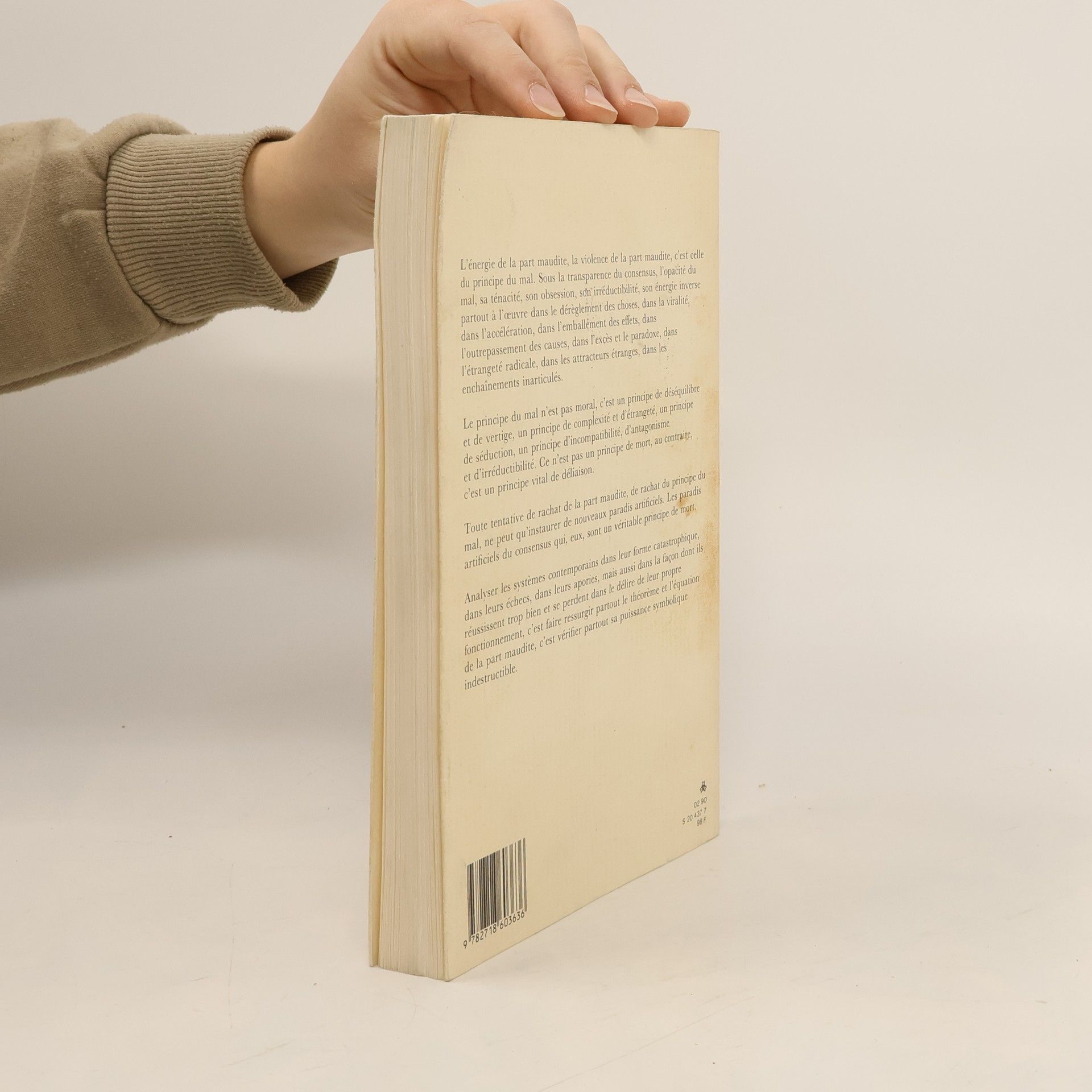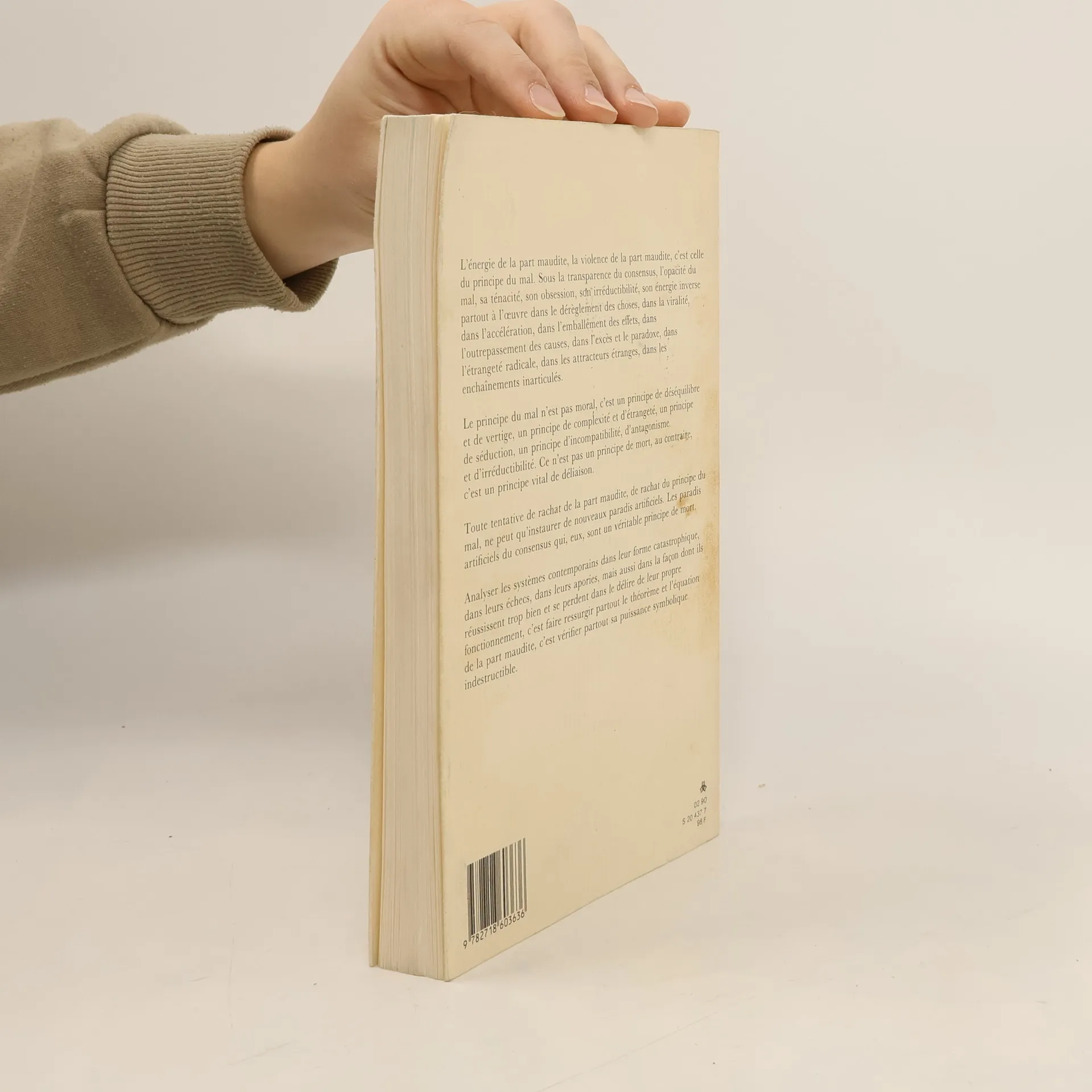 « L’énergie de la part maudite, la violence de la part maudite, c’est celle du principe du mal. Sous la transparence du consensus, l’opacité du mal, sa ténacité, son obsession, son irréductibilité, son énergie inverse partout à l’œuvre dans le dérèglement des choses, dans la viralité, dans l’accélération, dans l’emballement des effets, dans l’outre-passement des causes, dans l’excès et le paradoxe, dans l’étrangeté radicale, dans les attracteurs étranges, dans les enchaînements inarticulés. Le principe du mal n’est pas moral, c’est un principe de déséquilibre et de vertige, un principe de complexité et d’étrangeté, un principe de séduction, un principe d’incompatibilité, d’antagonisme et d’irréductibilité. Ce n’est pas un principe de mort, au contraire, c’est un principe vital de déliaison. Toute tentative de rachat de la part maudite, de rachat du principe du mal, ne peut qu’instaurer de nouveaux paradis artificiels. Les paradis artificiels du consensus qui, eux, sont un véritable principe de mort. Analyser les systèmes contemporains dans leur forme catastrophique, dans leurs échecs, dans leurs apories, mais aussi dans la façon dont ils réussissent trop bien et se perdent dans le délire de leur propre fonctionnement, c’est faire ressurgir partout le théorème et l’équation de la part maudite, c’est vérifier partout sa puissance symbolique indestructible. » J. B.