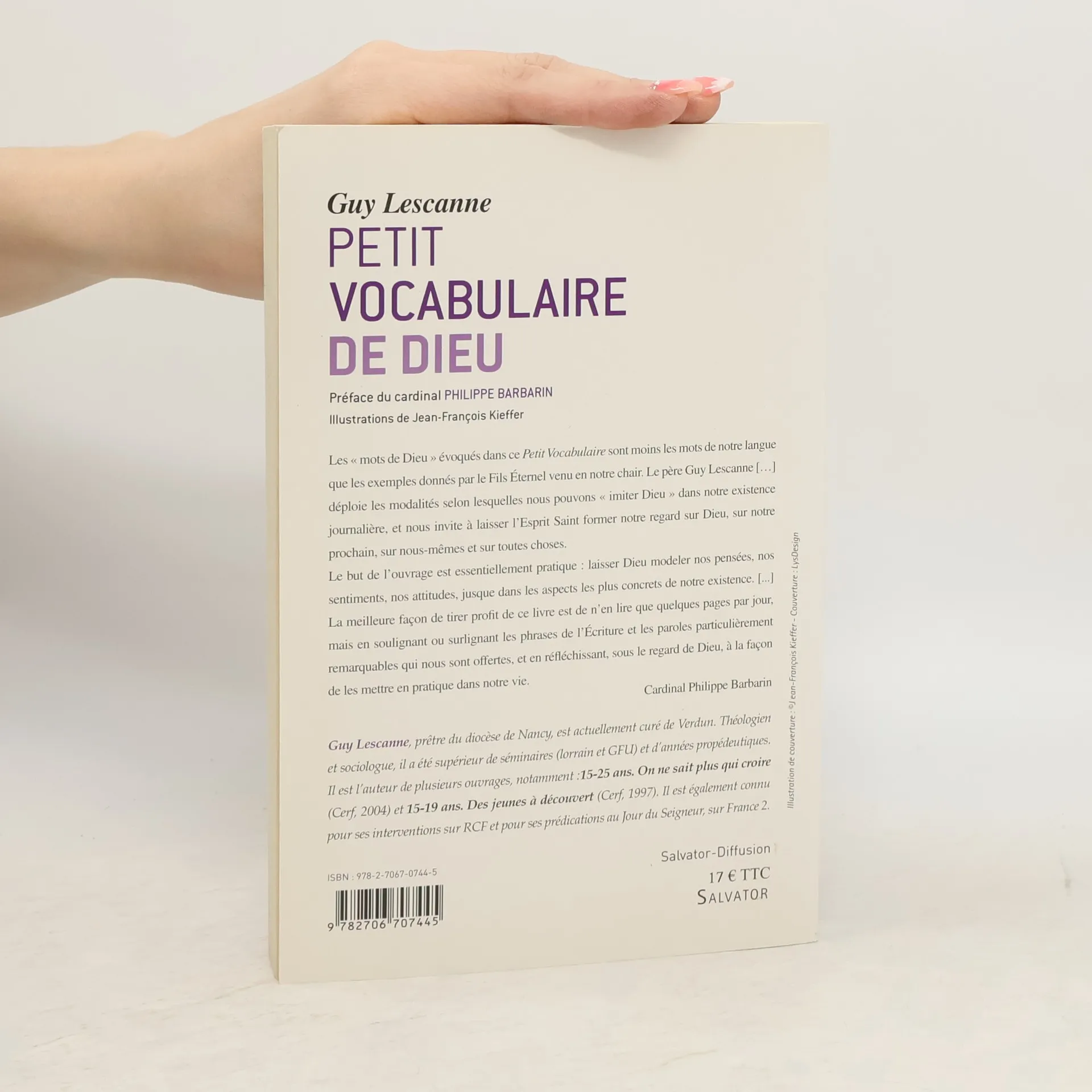 Les " mots de Dieu " évoqués dans ce Petit Vocabulaire sont moins les mots de notre langue que les exemples donnés par le Fils Eternel venu en notre chair. Le père Guy Lescanne déploie les modalités selon lesquelles nous pouvons " imiter Dieu " dans notre existence journalière. et nous invite à laisser l'Esprit Saint former notre regard sur Dieu, sur notre prochain, sur nous-mêmes et sur toutes choses. Le but de l'ouvrage est essentiellement pratique : laisser Dieu modeler nos pensées, nos sentiments, nos attitudes, jusque dans les aspects les plus concrets de notre existence. La meilleure façon de tirer profit de ce livre est de n'en lire que quelques pages par jour, mais en soulignant ou surlignant les phrases de l'Ecriture et les paroles particulièrement remarquables qui nous sont offertes, et en réfléchissant, sous le regard de Dieu, à la façon de les mettre en pratique dans notre vie. Cardinal Philippe Barbarin