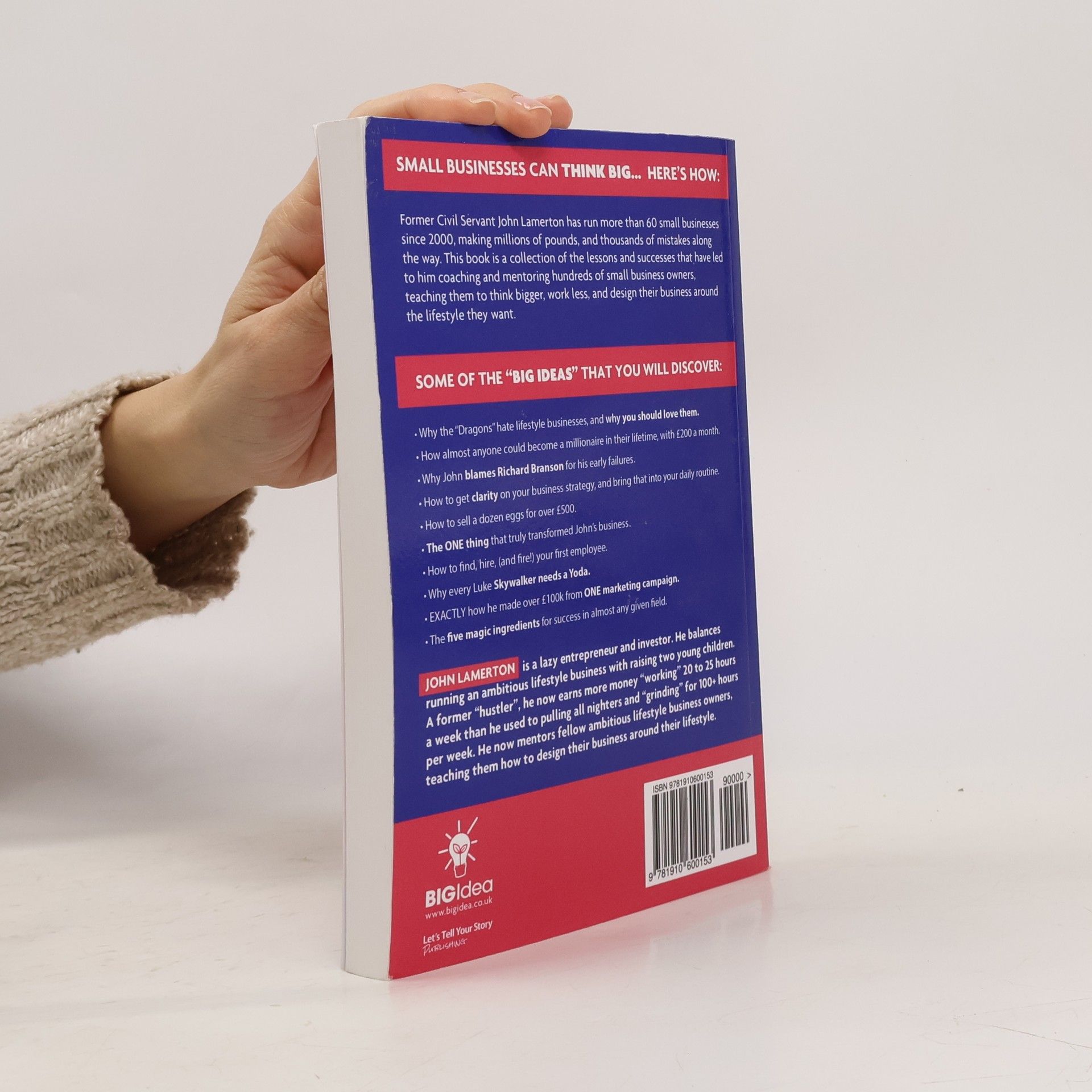 <b>SMALL BUSINESSES CAN THINK BIG... HERE'S HOW</b> Are you struggling to find marketing ideas for your small business? Does your business plan consist of a few scribbles on the back of a napkin? Does the thought of learning "online marketing" scare you? Do you find traditional business books dull, or uninspiring? Have you read business biographies of the poster boys (Richard Branson, Bill Gates, Warren Buffett, Alan Sugar, Elon Musk, Steve Jobs etc), only to feel a sense of overwhelm, and a complete disconnect between what they achieved, and where you are right now? Do you want to grow your small business, <b>without</b> having to learn complex marketing strategies, and <b>without</b> being told to simply "work harder than everyone else"? If so, then "Big Ideas... for Small Businesses" could be the "lightbulb moment" you've been waiting for... Former civil servant John Lamerton has run more than 60 small businesses since 2000, making millions of pounds, and thousands of mistakes along the way. This book is a collection of the lessons and successes that he uses to coach and mentor hundreds of small business owners, teaching them to think bigger, work less, and design their business around the lifestyle they want. <b>SOME OF THE "BIG IDEAS" THAT YOU WILL DISCOVER: </b> Why the "Dragons" hate lifestyle businesses, and why you should love them. How almost anyone could become a millionaire in their lifetime, given just �200 a month. Why John blames Richard Branson for his early failures How to get clarity on your business strategy, and bring that into your daily routine. How to sell a dozen eggs for over �500 The ONE thing that truly transformed John's business How to find, hire, (and fire!) your first employee. Why every Luke Skywalker needs a Yoda. EXACTLY how he made over �100k from ONE marketing campaign. The five magic ingredients for success in almost any given field. JOHN LAMERTON is a lazy entrepreneur and investor. He balances running an ambitious lifestyle business with raising two young children. A former "hustler," he now earns more money "working" 20 to 25 hours a week than he used to pulling all nighters and "grinding" for 100+ hours per week. He now mentors fellow ambitious lifestyle business owners, teaching them how to design their business around their lifestyle.