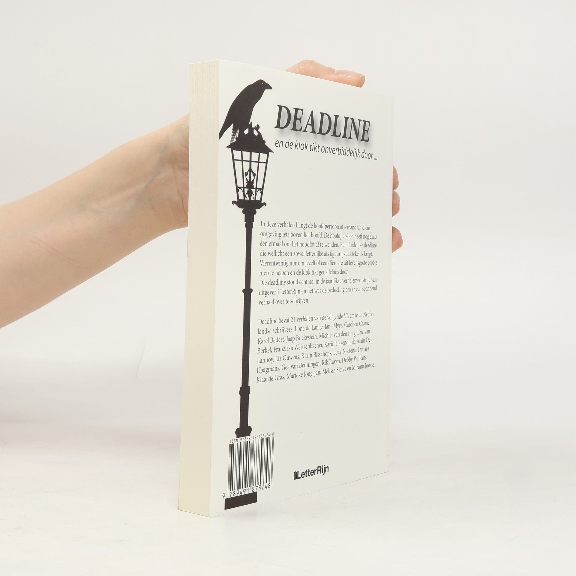 In deze verhalen hangt de hoofdpersoon of iemand uit diens omgeving iets boven het hoofd. De hoofdpersoon heeft nog exact één etmaal om het noodlot af te wenden. Een duidelijke deadline die wellicht een zowel letterlijke als figuurlijke betekenis krijgt. Vierentwintig uur om jezelf of een dierbare uit de levensgrote problemen te helpen en de klok tikt genadeloos door.Die deadline stond centraal in de jaarlijkse verhalenwedstrijd van uitgeverij LetterRijn en het was de bedoeling om er een spannend verhaal over te schrijven.Deadline bevat 21 verhalen van de volgende Vlaamse en Nederlandse schrijvers: Ilona de Lange, Iane Myre, Carolien Cramer, Karel Bedert, Jaap Boekestein, Michiel van den Berg, Eric van Berkel, Franziska Weissenbacher, Karin Hazendonk, Alain De Lannoy, Liz Ouwens, Karin Bisschops, Lucy Neetens, Tamara Haagmans, Gea van Beuningen, Rik Raven, Debby Willems, Klaartje Gras, Marieke Jongejan, Melissa Skaye en Miriam Joosse.