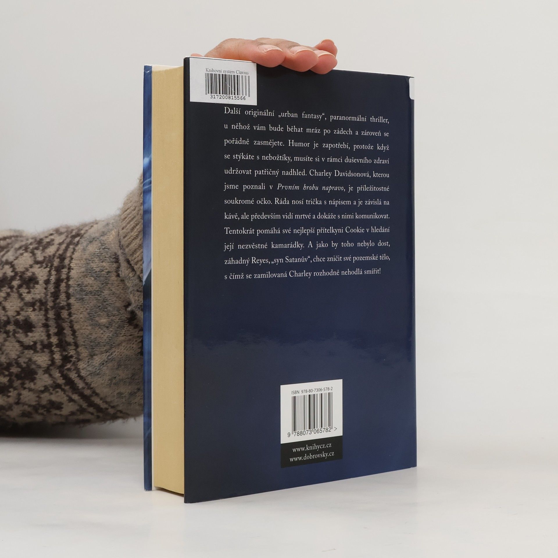 Další originální „urban fantasy“, paranormální thriller, u něhož vám bude běhat mráz po zádech a zároveň se pořádně zasmějete. Humor je zapotřebí, protože když se stýkáte s nebožtíky, může vám to zkomplikovat život. Charley Davidsonová, kterou jsme poznali v Prvním hrobu napravo, je příležitostné soukromé očko a pracuje se zesnulými na plný úvazek. Tentokrát se snaží pomoct své nejlepší přítelkyni Cookie v hledání její nezvěstné kamarádky. A jako by toho nebylo dost, záhadný Reyes, „syn Satanův“, opustil své pozemské tělo a teď za Charley chodí jako duch. Je to nezbytné, protože jedině tak se podaří Charley ochránit před temnými démony, kteří jsou mnohem otravnější než mrtví lidé!
