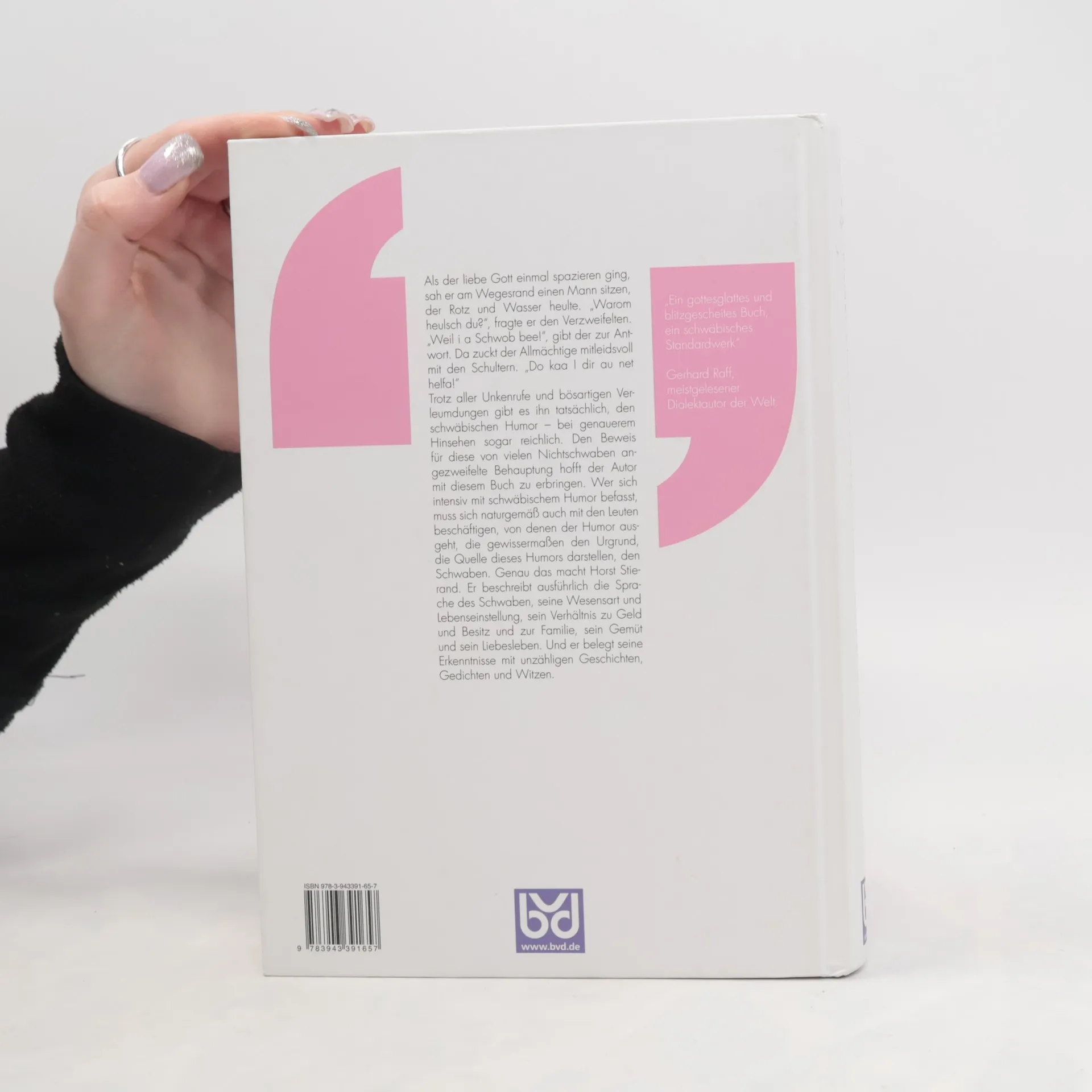 Aller Unkenrufe und bösartigen Verleumdungen zum Trotz gibt es ihn tatsächlich, den schwäbischen Humor – bei genauerem Hinsehen sogar reichlich. Den Beweis für diese von vielen Nichtschwaben angezweifelte Behauptung hofft Horst Stierand mit diesem Buch zu erbringen. Er beschreibt ausführlich die Sprache des Schwaben, seine Wesensart und Lebenseinstellung, sein Verhältnis zu Geld und Besitz und zur Familie, sein Gemüt und sein Liebesleben. Und er belegt seine Erkenntnisse mit unzähligen Geschichten, Gedichten und Witzen. „Ein gottesglattes und blitzgescheites Buch, ein schwäbisches Standardwerk“, sagt Gerhard Raff, der meistgelesene Dialektautor der Welt.