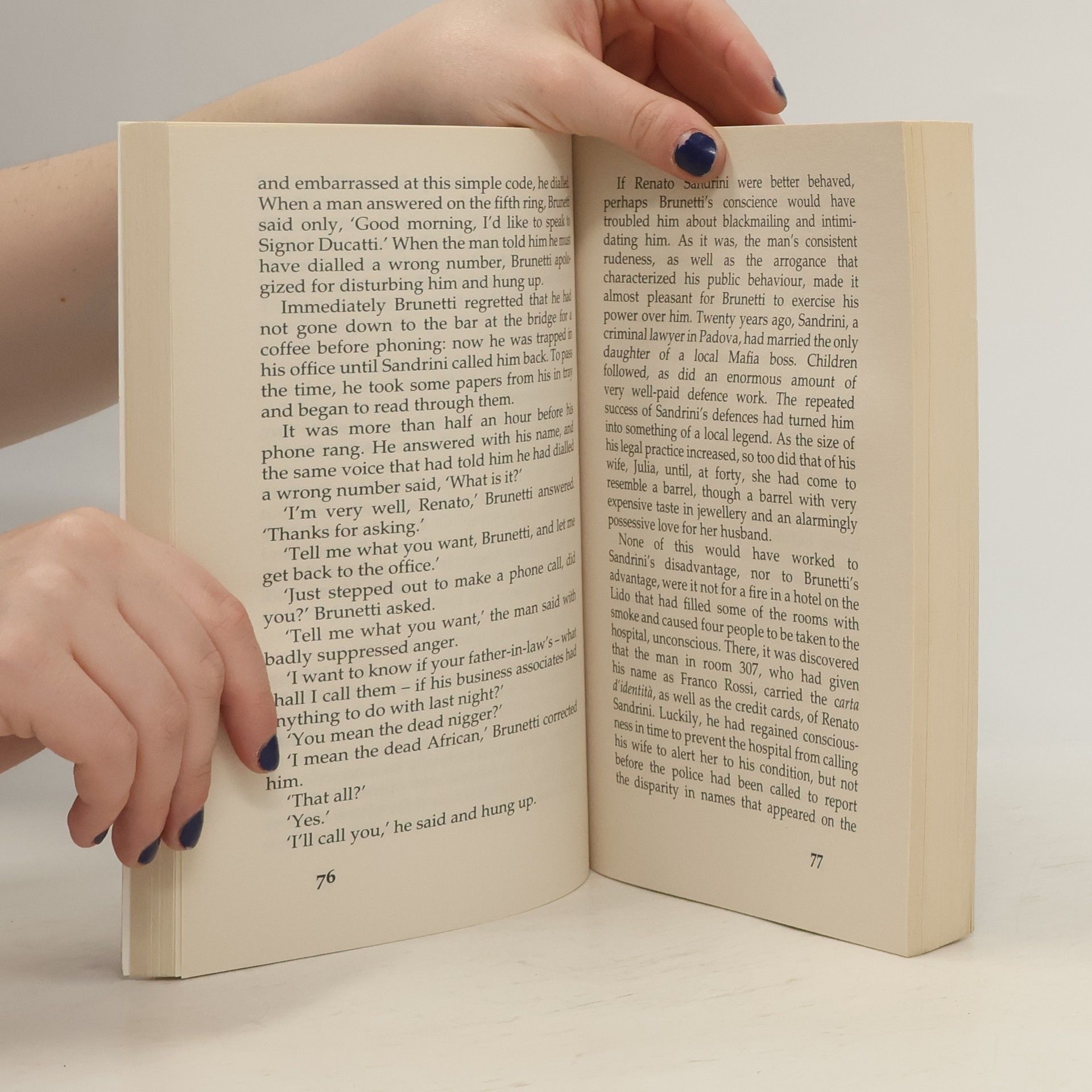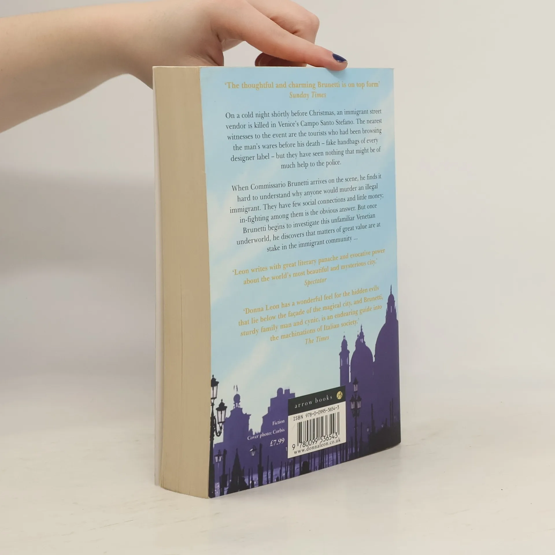 On a cold night shortly before Christmas, an immigrant street vendor is killed in Venice's Campo Santo Stefano. The nearest witnesses to the event are the tourists who had been browsing the man's wares before his death - fake handbags of every designer label - but they have seen nothing that might be of much help to the police.