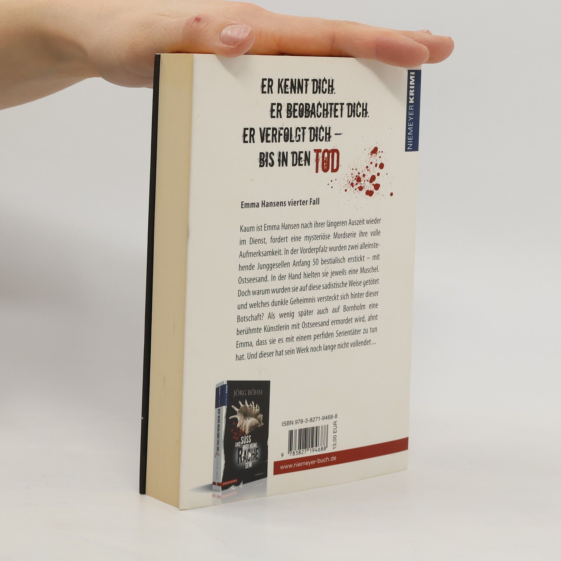 ER KENNT DICH. ER BEOBACHTET DICH. ER VERFOLGT DICH – BIS IN DEN TOD.Emma Hansens vierter FallKaum ist Emma Hansen nach ihrer längeren Auszeit wieder im Dienst, fordert eine mysteriöse Mordserie ihre volle Aufmerksamkeit. In der Vorderpfalz wurden zwei alleinstehende Junggesellen Anfang 50 bestialisch erstickt – mit Ostseesand. In der Hand hielten sie jeweils eine Muschel. Doch warum wurden sie auf diese sadistische Weise getötet und welches dunkle Geheimnis versteckt sich hinter dieser Botschaft? Als wenig später auch auf Bornholm eine berühmte Künstlerin mit Ostseesand ermordet wird, ahnt Emma, dass sie es mit einem perfiden Serientäter zu tun hat. Und dieser hat sein Werk noch lange nicht vollendet ...
