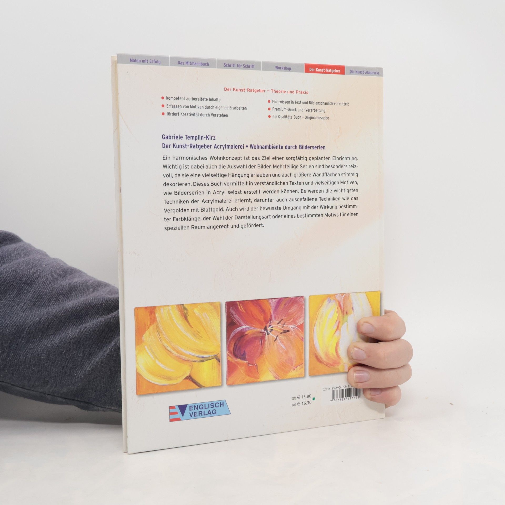 Ein harmonisches Wohnkonzept ist das Ziel einer sorgfältig geplanten Einrichtung. Wichtig ist dabei auch die Auswahl der Bilder. Mehrteilige Serien sind besonders reizvoll, da sie eine vielseitige Hängung erlauben und auch größere Wandflächen stimmig dekorieren. Dieses Buch vermittelt in verständlichen Texten und vielseitigen Motiven, wie Bilderserien in Acryl selbst erstellt werden können. Es werden die wichtigsten Techniken der Acrylmalerei erlernt, darunter auch ausgefallene Techniken wie das Vergolden mit Blattgold. Auch wird der bewusste Umgang mit der Wirkung bestimmter Farbklänge, der Wahl der Darstellungsart oder eines bestimmten Motivs für einen speziellen Raum angeregt und gefördert.