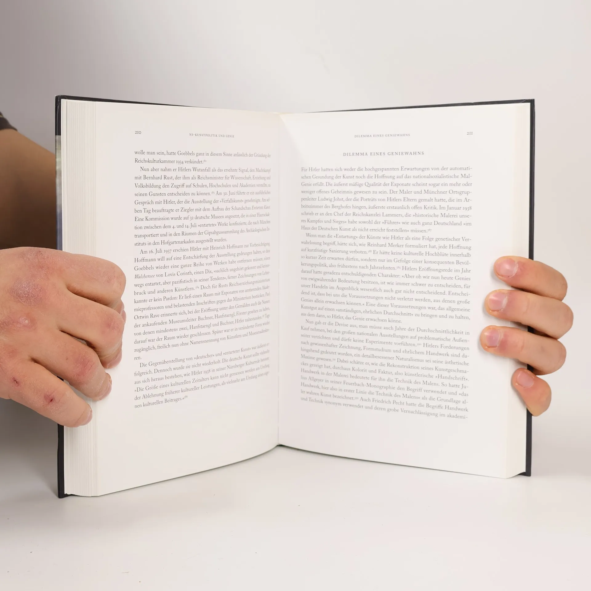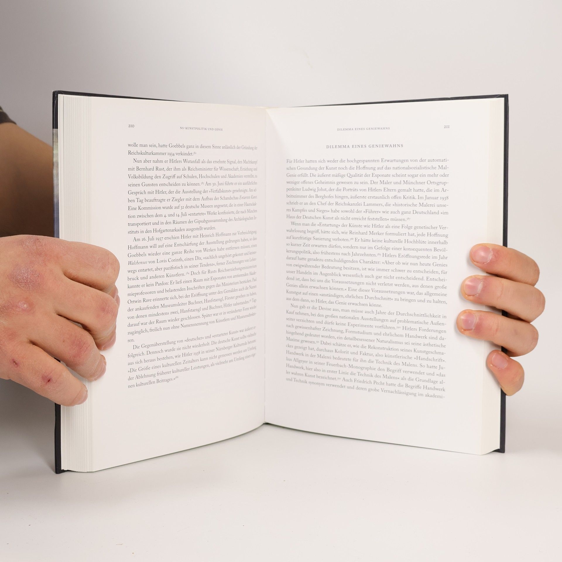 Zu den folgenreichsten Eigenschaften Hitlers gehorte, dass er sich fur ein Genie hielt. Ubernommen hatte er die Genievorstellung bereits in seiner Jugend aus Kunstlerbiographien des 19. Jahrhunderts. Nach seiner Ablehnung an der Wiener Akademie verinnerlichte er sie im Konzept des verkannten Kunstlers. Das romantische Geniekonzept, das sich langst ideologisiert und mit nationalistischen, rassistischen und antisemitischen Inhalten aufgeladen hatte, bildete die Basis seiner Weltanschauung und Selbstkonzeption als "Fuhrer," Kunstler-Politiker und Stratege. Kunstlertum und Geniewahn erzeugten auch die Notwendigkeit der standigen Selbstbestatigung und Selbstdarstellung als Kunstfreund und Mazen und bildeten damit die Grundlage fur die Kulturbesessenheit des Dritten Reiches. War die Architektur das Medium des NS-Staates, so dienten historische Gemalde Hitlers personlicher Imagepflege. Erstmalig werden die Gemaldekollektionen in Hitlers Wohnungen und diversen Residenzen vorgestellt und ihre Bedeutung rekonstruiert, die die Hauptwerke fur den Diktator hatten. Seinen Abgang aus der Geschichte plante Hitler als Kunstsammler und Stifter einer Gemaldegalerie. "Kriege," so ausserte er 1942, "kommen und vergehen, was bleibt, sind einzig die Werke der Kultur." Aus dem Galerieprojekt bezog er psychische Energien, die den Zweiten Weltkrieg verlangerten und Millionen Leben kosteten.