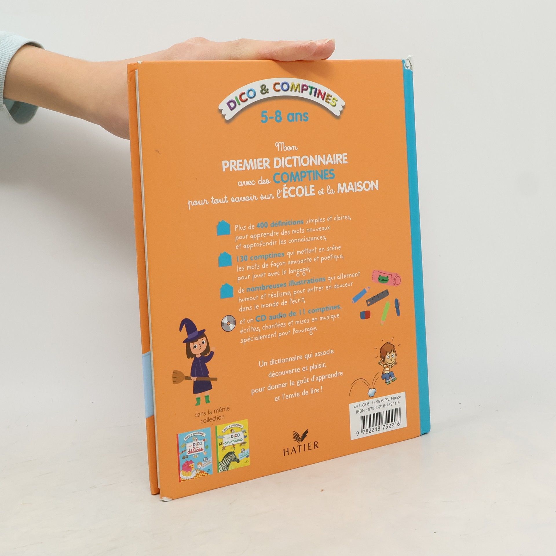 Mon premier dictionnaire avec des comptines pour tout savoir sur l'école et la maison. Plus de 400 définitions simples et claires, pour apprendre des mots nouveaux et approfondir les connaissances ; 130 comptines qui mettent en scène les mots de façon amusante et poétique, pour jouer avec le langage ; de nombreuses illustrations qui alternent humour et réalisme, pour entrer en douceur dans le monde de l'écrit ; et un CD audio de 11 comptines, écrites, chantées et mises en musique spécialement pour l'ouvrage. Un dictionnaire qui associe découverte et plaisir, pour donner le goût d'apprendre et l'envie de lire !