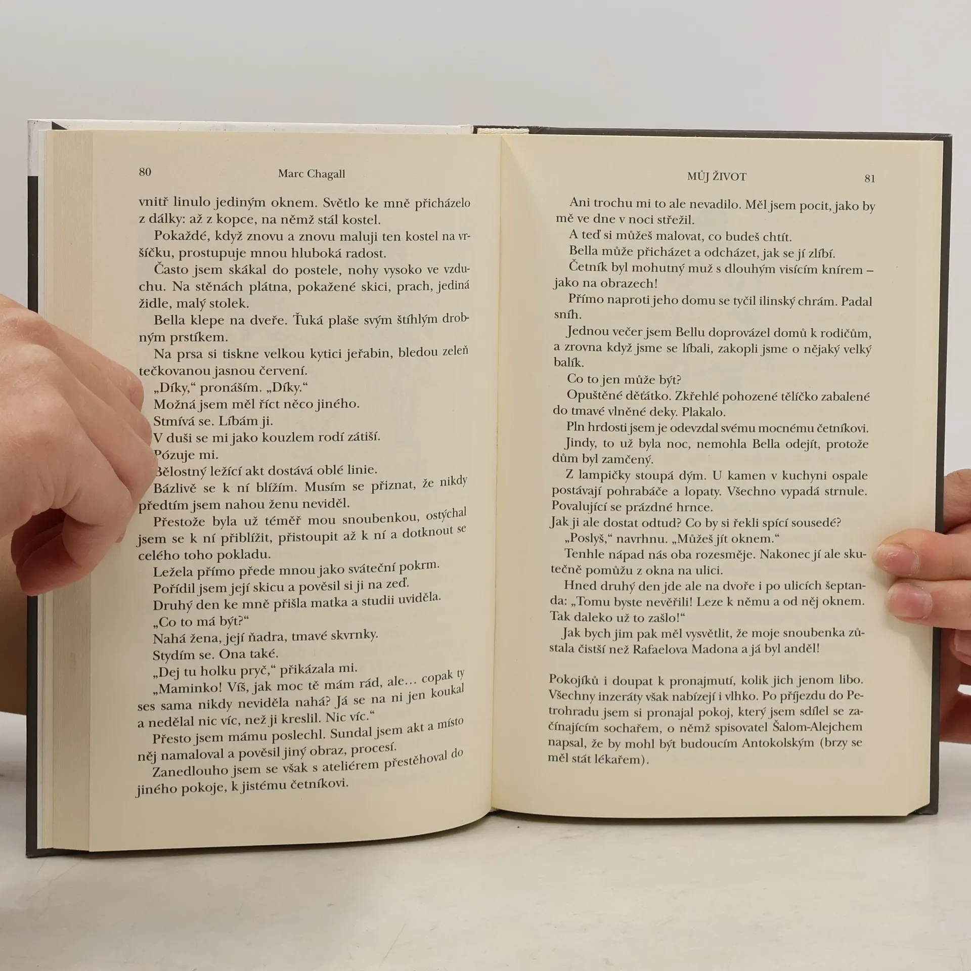 Nahlédněme do malířovy duše jeho vlastníma očima a nechme se okouzlit… Chagall celý svůj život vyprávěl příběhy, příběhy svého života, příběhy zaniklého světa, příběhy svých radostí, ale i obav a smutku… Autobiografická kniha Můj život je psána slovy básnickými v jejich nejprostší, čisté podobě. Muzikanti, chudinské figurky, židovští sousedé na střechách, krávy létající stejně jako vousatí rabíni, to všechno na jeho obrazech stoupá k nebesům. Jsou to andělští poslové, mířící vzhůru ze všech kontinentů. Před očima ožívají rázovité postavy malířových mladých let, dojemné vzpomínky na rodiče, abychom se s ním vypravili do Petrohradu a posléze do Paříže, plné nových malířů, od Picassa až po Modiglianiho, kam ho přivedla jeho největší touha: malovat. Touha být svůj a ukázat svůj svět. Chagall lačně hltá všechny pařížské dojmy a přetavuje je do obrazů. Mohl snad někdo tušit, že jednou ten chudý židovský chlapec z Vitebska vyzdobí strop pařížské Opery, provede oslňující vitráže katedrály v Métách a v Chichesteru, v kostele v Curychu, v New Yorku, že se za jeho účasti otevře Národní muzeum biblického poselství Marka Chagalla v Nizze? Ma vie je ovšem také velkou milostnou básní… jeho žena Bella jednou provždy vstoupí do jeho obrazů a neopustí je ani po své smrti…