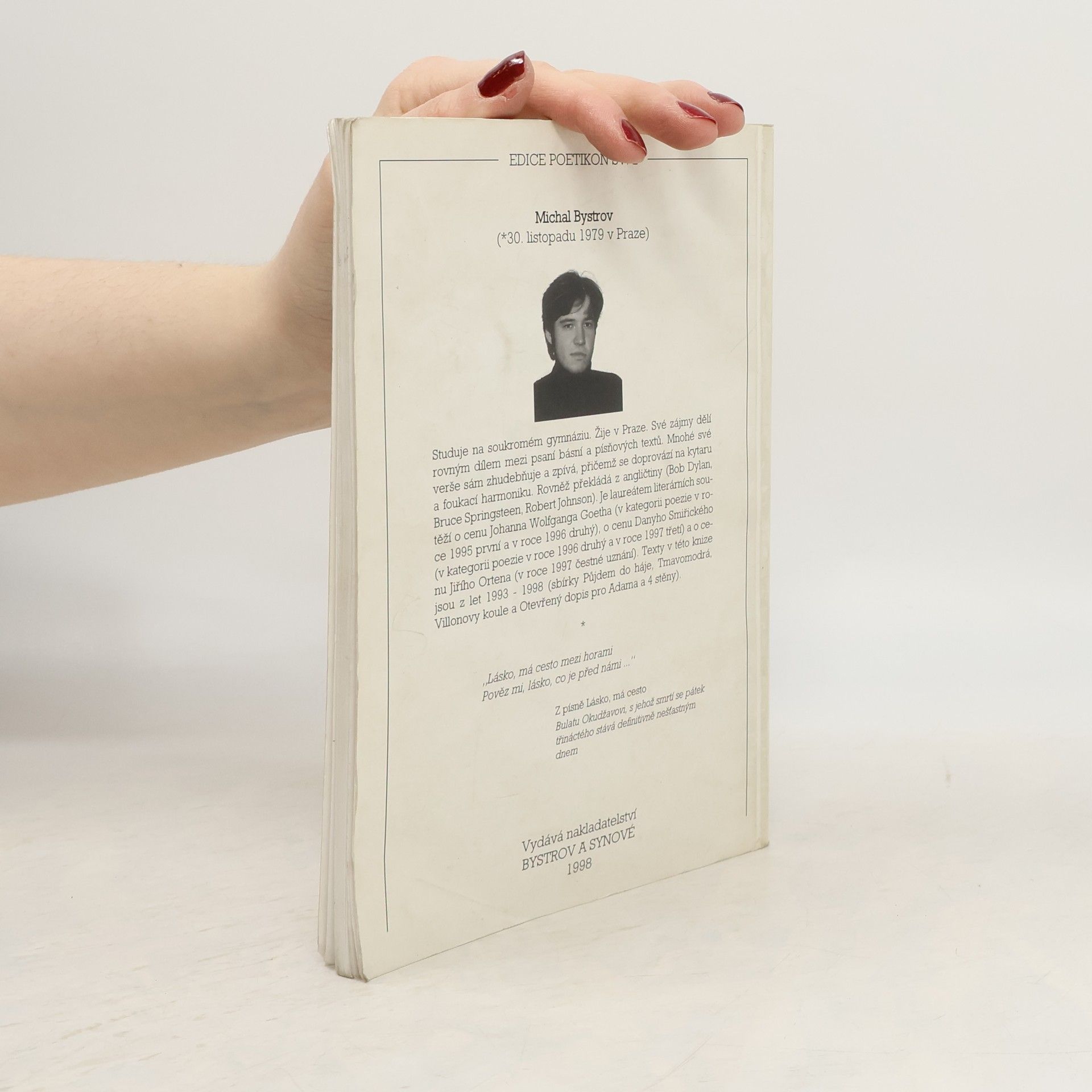 Texty mladého autora (*1979), nositele několika literárních cen, jsou z let 1993-1998 (sbírky Půjdem do háje, Tmavomodrá, Villonovy koule a Otevřený dopis a 4 stěny).
