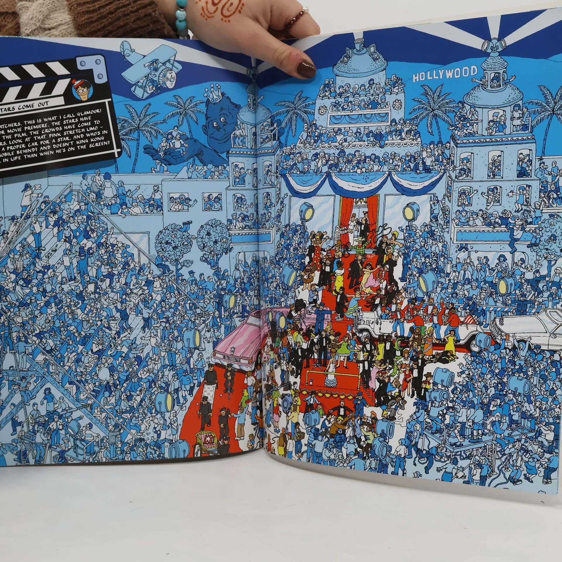 Hey, Waldo fans! Sharpen your eyes and your wits, because Waldo is taking you on a whole new star-studded adventure. That's right, you're going to Hollywood! Follow Waldo—if you can find him—through a cast of thousands on the bustling streets of the great movie classics. Is he there in the chorus line of that musical in production, or up on the ramparts of that epic war film? Or is our elusive, bespectacled hero right in the middle of the swashbuckling escapades of the Three Musketeers? Waldo and all his lost objects are harder to find than ever in this hilarious new challenge for eager Waldo-hunters everywhere!
