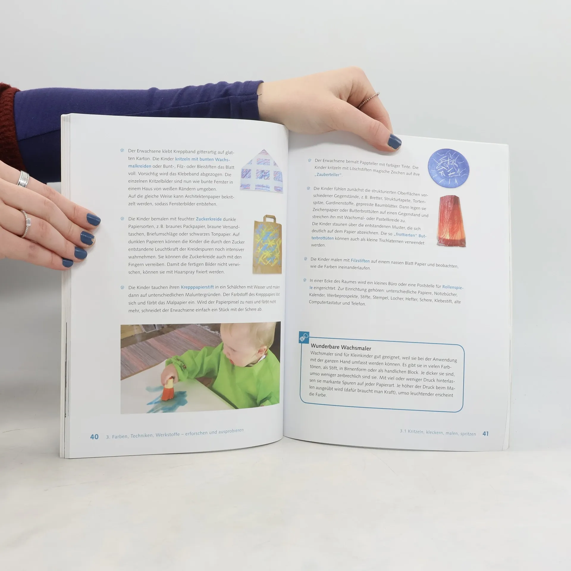 Kleinkinder brauchen die Möglichkeit zur Entfaltung der eigenen Kreativität. Wie entwickelt sich die Wahrnehmung, das Vorstellungsvermögen, das bildnerische Gestalten. In diesem Buch finden Sie wertvolle Praxisideen mit erprobten Gestaltungsmaterialien sowie geeigneten Gestaltungstechniken. Pädagogische Tipps und sicherheitsrelevanten Hinweisen sowie originelle Präsentationstechniken, machen dieses Buch zu einem tollen Begleiter für den Krippenalltag.