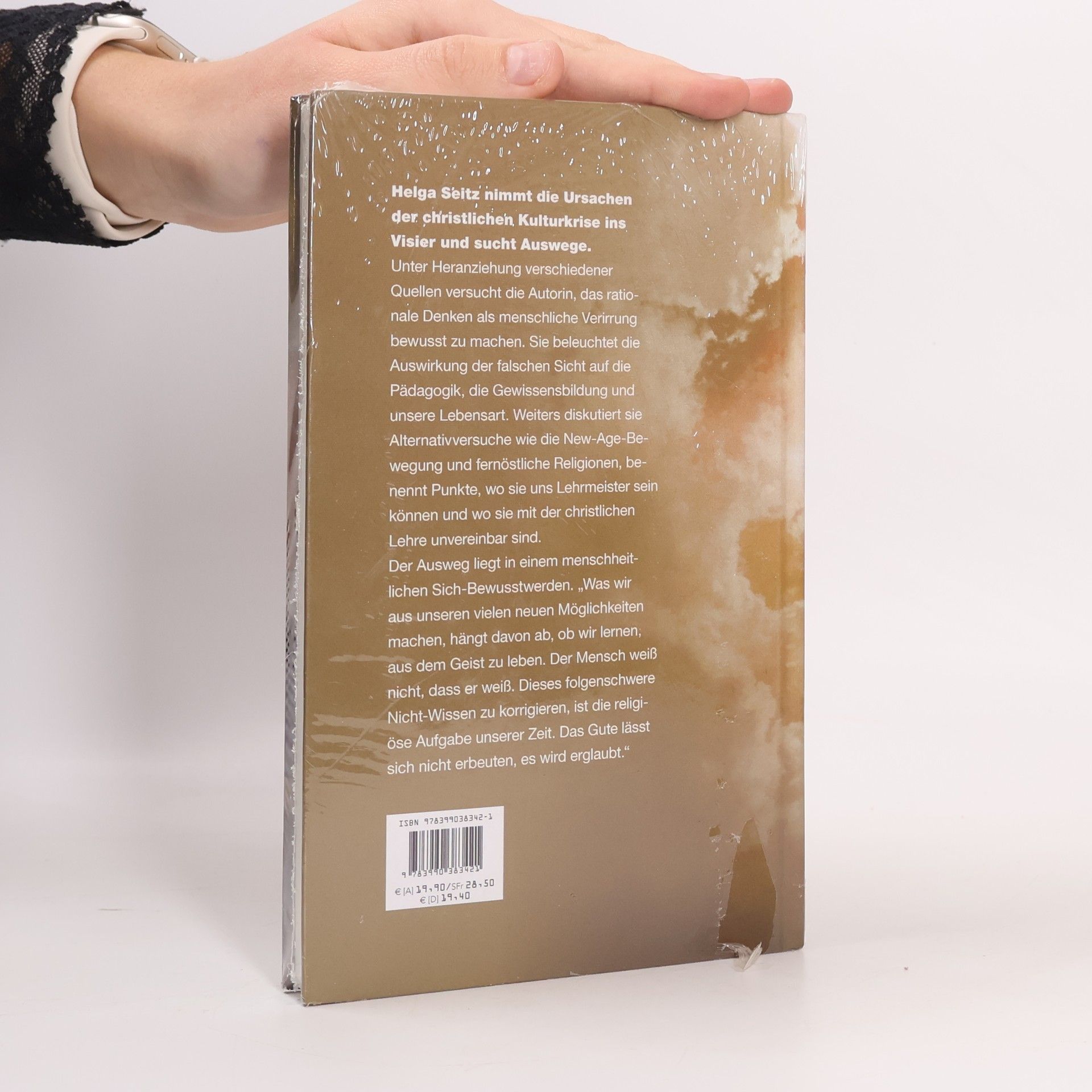 Helga Seitz nimmt die Ursachen der christlichen Kulturkrise ins Visier und sucht Auswege. Unter Heranziehung verschiedener Quellen versucht die Autorin, das rationale Denken als menschliche Verirrung bewusst zu machen. Sie beleuchtet die Auswirkung der falschen Sicht auf die Pädagogik, die Gewissensbildung und unsere Lebensart. Weiters diskutiert sie Alternativversuche wie die New-Age-Bewegung und fernöstliche Religionen, benennt Punkte, wo sie uns Lehrmeister sein können und wo sie mit der christlichen Lehre unvereinbar sind. Der Ausweg liegt in einem menschheitlichen Sich-Bewusstwerden. „Was wir aus unseren vielen neuen Möglichkeiten machen, hängt davon ab, ob wir lernen, aus dem Geist zu leben. Der Mensch weiß nicht, dass er weiß. Dieses folgenschwere Nicht-Wissen zu korrigieren, ist die religiöse Aufgabe unserer Zeit. Das Gute lässt sich nicht erbeuten, es wird erglaubt.“
