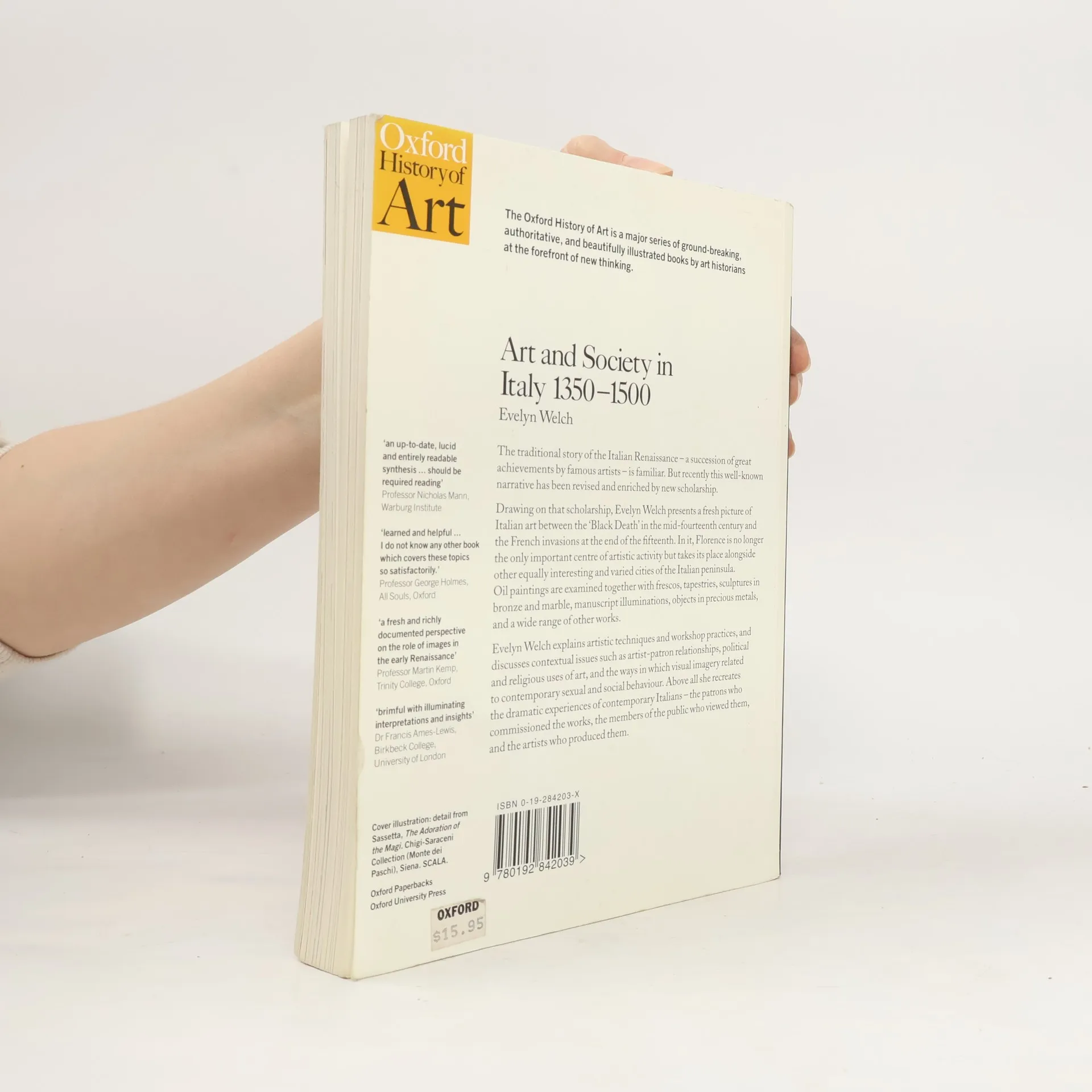 Evelyn Welch presents a fresh picture of Italian art between the 'Black Death' in the mid-fourteenth century and the French invasions at the end of the fifteenth. In it, Florence is no longer the only important centre of artistic activity but takes its place alongside other equally interesting and varied cities of the Italian peninsula. Oil paintings are examined alongside frescos, tapestries, sculptures in bronze and marble, manuscript illuminations, objects in precious metals, and a wide range of other works. Evelyn Welch explains artistic techniques and workshop practices, and discusses contextual issues such as artist-patron relationships, political and religious uses of art, and the ways in which visual imagery related to contemporary sexual and social behaviour. Above all she recreates the dramatic experiences of contemporary Italians - the patrons who commissioned the works, the members of the public who viewed them, and the artists who produced them.
