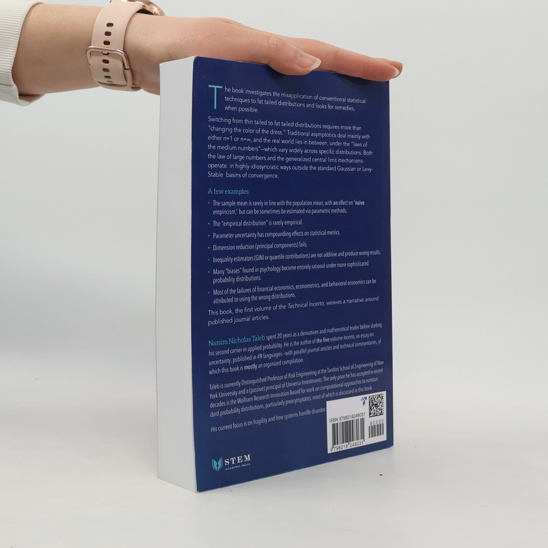The monograph investigates the misapplication of conventional statistical techniques to fat tailed distributions and looks for remedies, when possible.Switching from thin tailed to fat tailed distributions requires more than "changing the color of the dress". Traditional asymptotics deal mainly with either n=1 or n=?, and the real world is in between, under of the "laws of the medium numbers" --which vary widely across specific distributions. Both the law of large numbers and the generalized central limit mechanisms operate in highly idiosyncratic ways outside the standard Gaussian or Levy-Stable basins of convergence.A few examples:+ The sample mean is rarely in line with the population mean, with effect on "naive empiricism", but can be sometimes be estimated via parametric methods.+ The "empirical distribution" is rarely empirical.+ Parameter uncertainty has compounding effects on statistical metrics.+ Dimension reduction (principal components) fails.+ Inequality estimators (GINI or quantile contributions) are not additive and produce wrong results.+ Many "biases" found in psychology become entirely rational under more sophisticated probability distributions+ Most of the failures of financial economics, econometrics, and behavioral economics can be attributed to using the wrong distributions.This book, the first volume of the Technical Incerto, weaves a narrative around published journal articles.