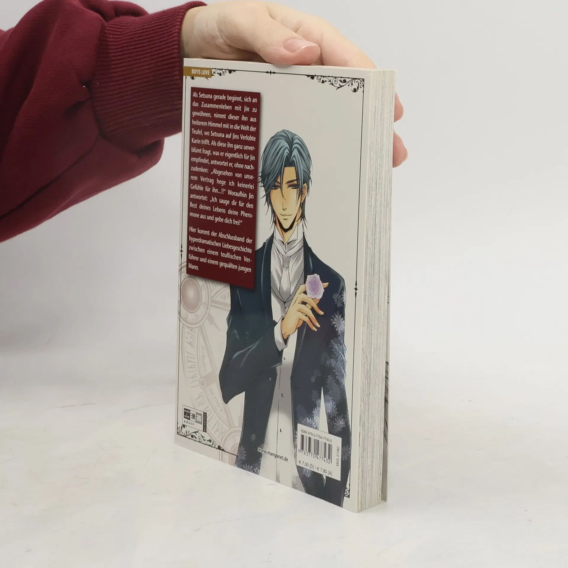 Als Setsuna gerade beginnt, sich an das Zusammenleben mit Jin zu gewöhnen, nimmt dieser ihn aus heiterem Himmel mit in die Welt der Teufel, wo Setsuna auf Jins Verlobte Karin trifft. Als diese ihn ganz unverblümt fragt, was er eigentlich für Jin empfindet, antwortet er, ohne nachhzudenken: „Abgesehen von unserem Vertrag hege ich keinerlei Gefühle für ihn…!!“ Woraufhin Jin antwortet: „Ich sauge dir für den Rest deines Lebens deine Pheromone aus und gebe dich frei!“ Hier kommt der Abschlussband der hyperdramatischen Liebesgeschichte zwischen einem teuflischen Verführer und einem gequälten jungen Mann.