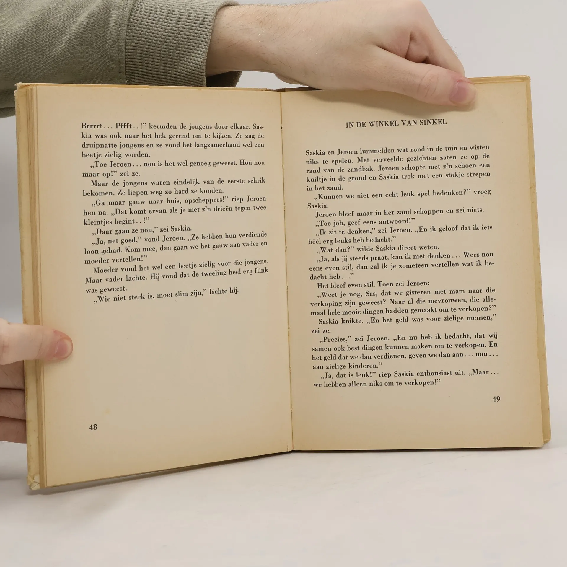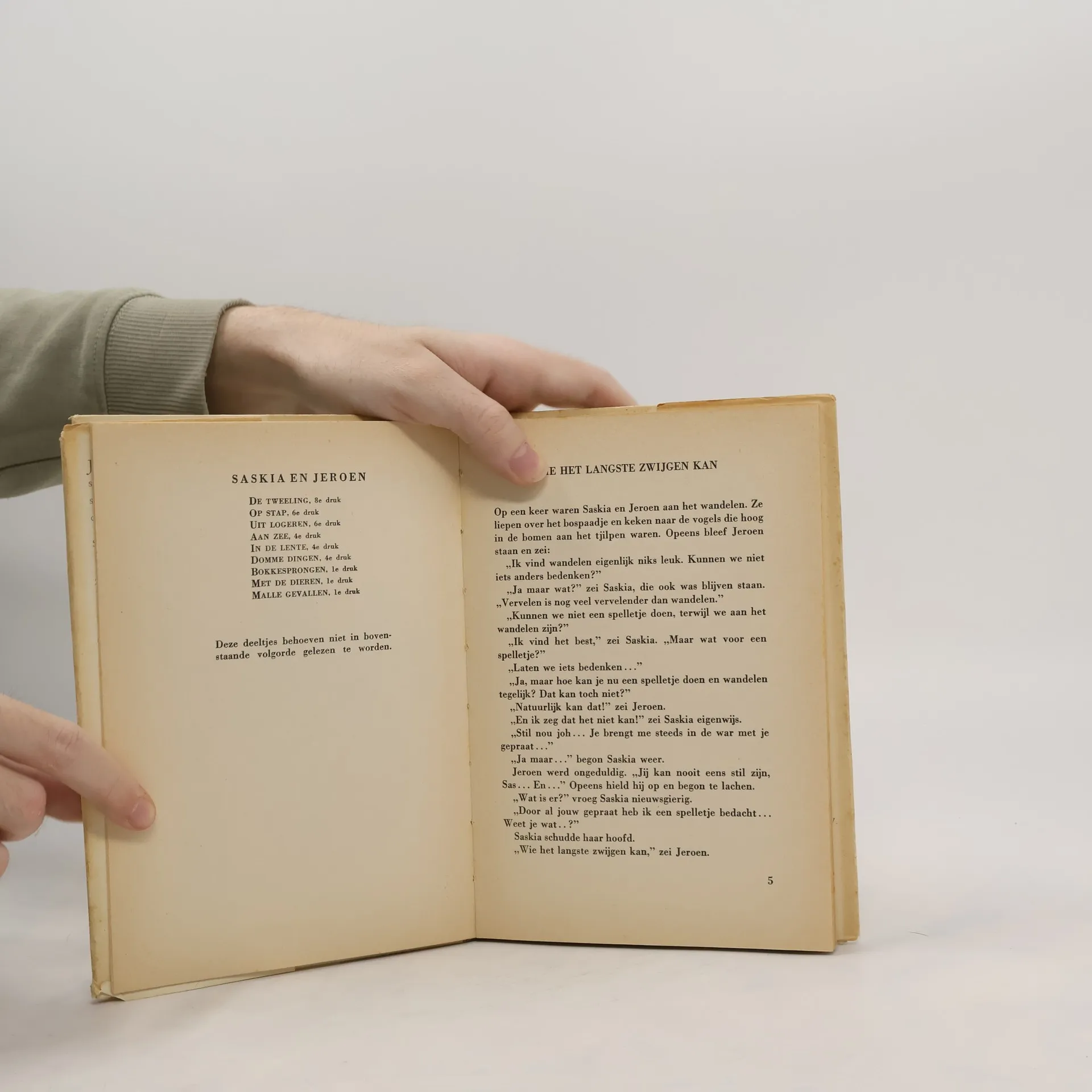 Saskia en Jeroen doen echt hun best om lief te zijn. Maar dat ze dat niet altijd volhouden, weet iedereen. Jeroen wil aan Saskia bewijzen dat hij makkelijk in een hoge boom kan klimmen. Via de keukentrap klimt hij hoger en hoger. Totdat hij er niet meer uit durft. Gelukkig komt de postbode hem redden. Op 1 april haalt de tweeling het halve huis leeg, zodat het net lijkt of er inbrekers zijn geweest. Maar als hun vader daarachter komt, heeft hij ook nog wel een leuke één-april-grap achter de hand...