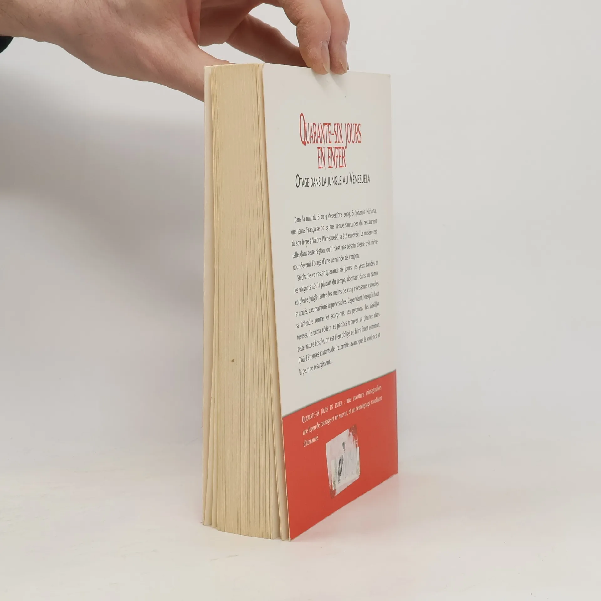 Dans la nuit du 8 au 9 décembre 2003, Stéphanie Minana, une jeune Française de 25 ans venue s'occuper du restaurant de son frère à Valera (Venezuela), a été enlevée. La misère est telle, dans cette région, qu'il n'est pas besoin d'être très riche pour devenir l'otage d'une demande de rançon. Stéphanie va rester quarante-six jours, les yeux bandés et les poignets liés la plupart du temps, dormant dans un hamac en pleine jungle, entre les mains de cinq ravisseurs cagoulés et armés, aux réactions imprévisibles. Cependant, lorsqu'il faut se défendre contre les scorpions, les pythons, les abeilles tueuses, le puma rôdeur et parfois trouver sa pitance dans cette nature hostile, on est bien obligé de faire front commun. D'où d'étranges instants de fraternité, avant que la violence et la peur ne resurgissent... QUARANTE-SIX JOURS EN ENFER : une aventure inimaginable, une leçon de courage et de survie, et un témoignage troublant.